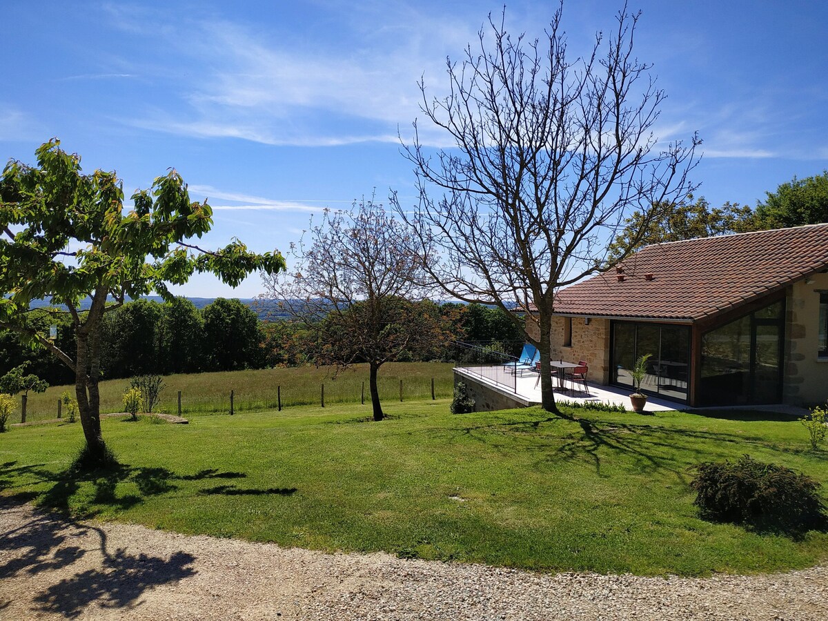 L'Oustal Pitchou is a charming little house 7 minutes from Figeac, a town with all the shops and services. Here, we are first seduced by the panoramic view of the valley and the surrounding countryside; we appreciate this veranda with large bay windows which opens onto the large living room in a style combining stone, wood and contemporary furniture; we like the room with the original layout and the bathroom with high quality equipment. The leisure center 10 minutes from the cottage and Lake Tolermo 20 minutes will please everyone!