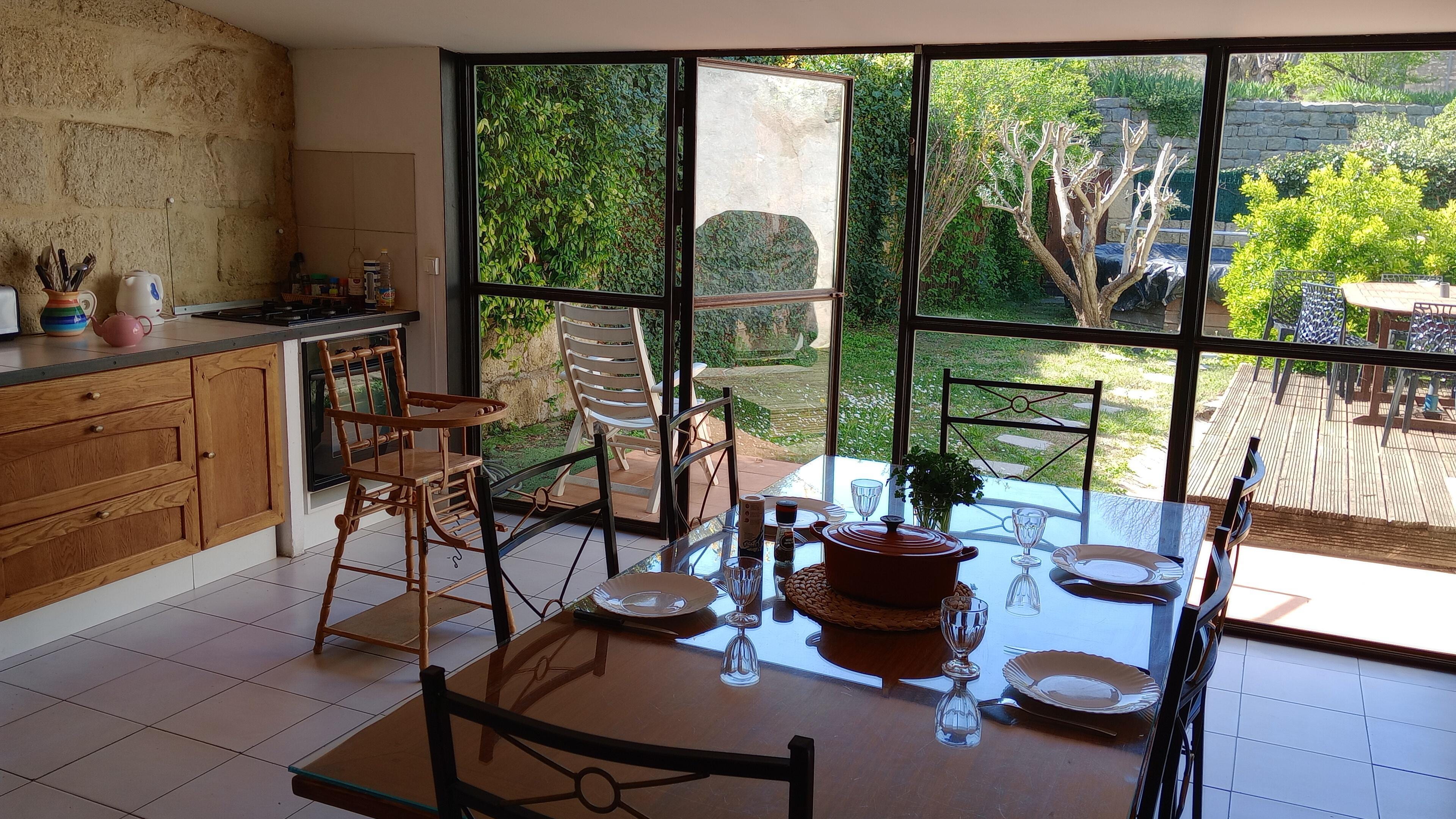 Old house completely renovated in the heart of the historic center of Lunel, 2 steps from the shops. Private parking space The house (about 100m2) is fully designed and equipped for a successful holiday. The garden (90 m2) with its secure and heated swimming pool * (Out of season, April May June and Sept Oct All Saints holidays included depending on the weather), for maximum comfort and early or late swimming. For even more security, the outdoor ladder of the pool is retractable to prevent access by children. The house has a very beautiful and large open kitchen / living area overlooking the garden through a superb 4m wide wrought iron bay window. Splendid view of a magnificent old building.