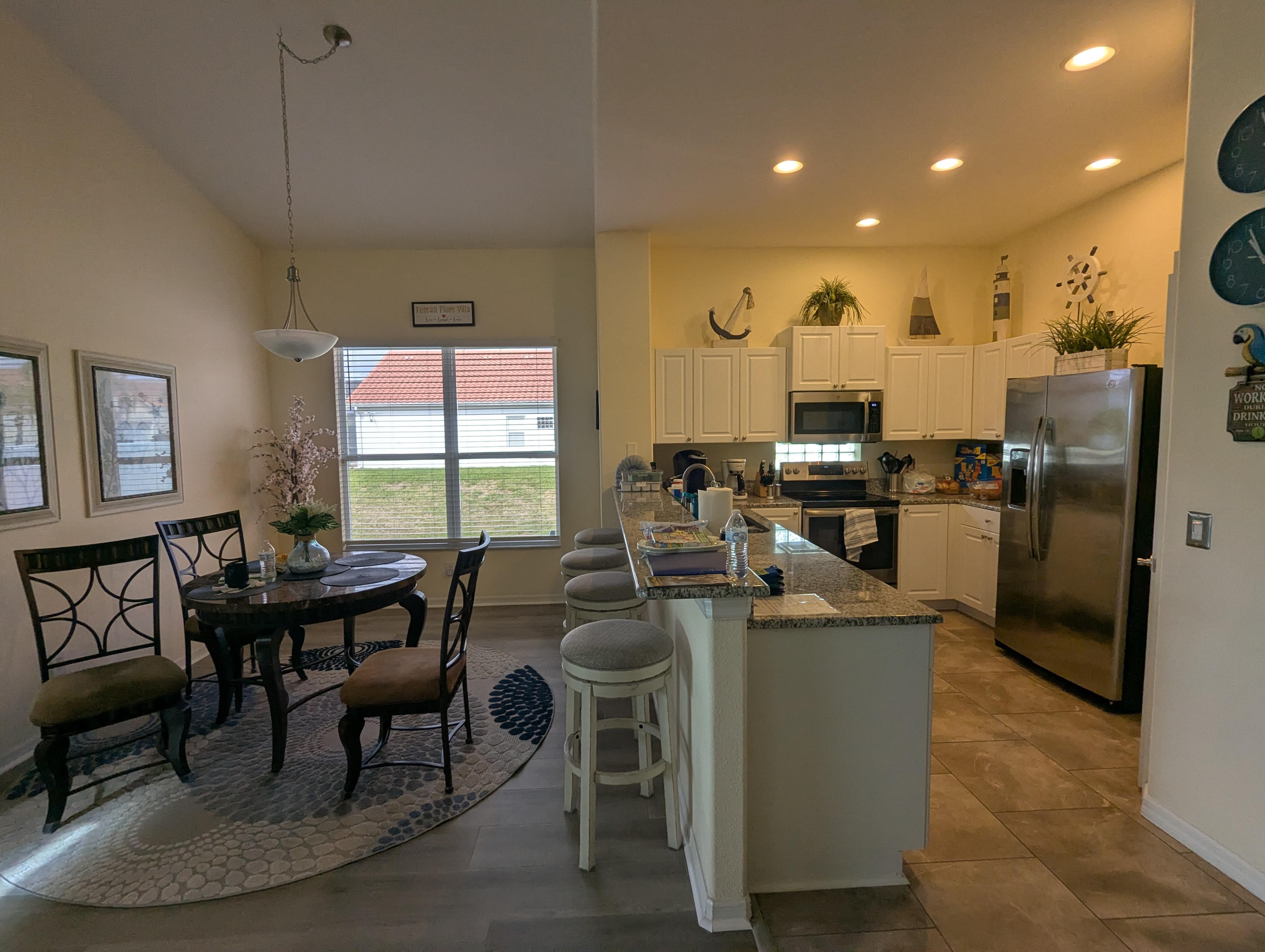 We stayed two weeks at the Tuscan Hills Villa. The place is perfect, it is very comfortable from the beds to the dining and kitchen for eating in or storing cold drinks and leftovers. The pool was very relaxing and nice. We played cards out on the lanai a couple nights. It is located close to all shopping, restaurants and Disney parks. We had such a great trip and would love to stay here again.