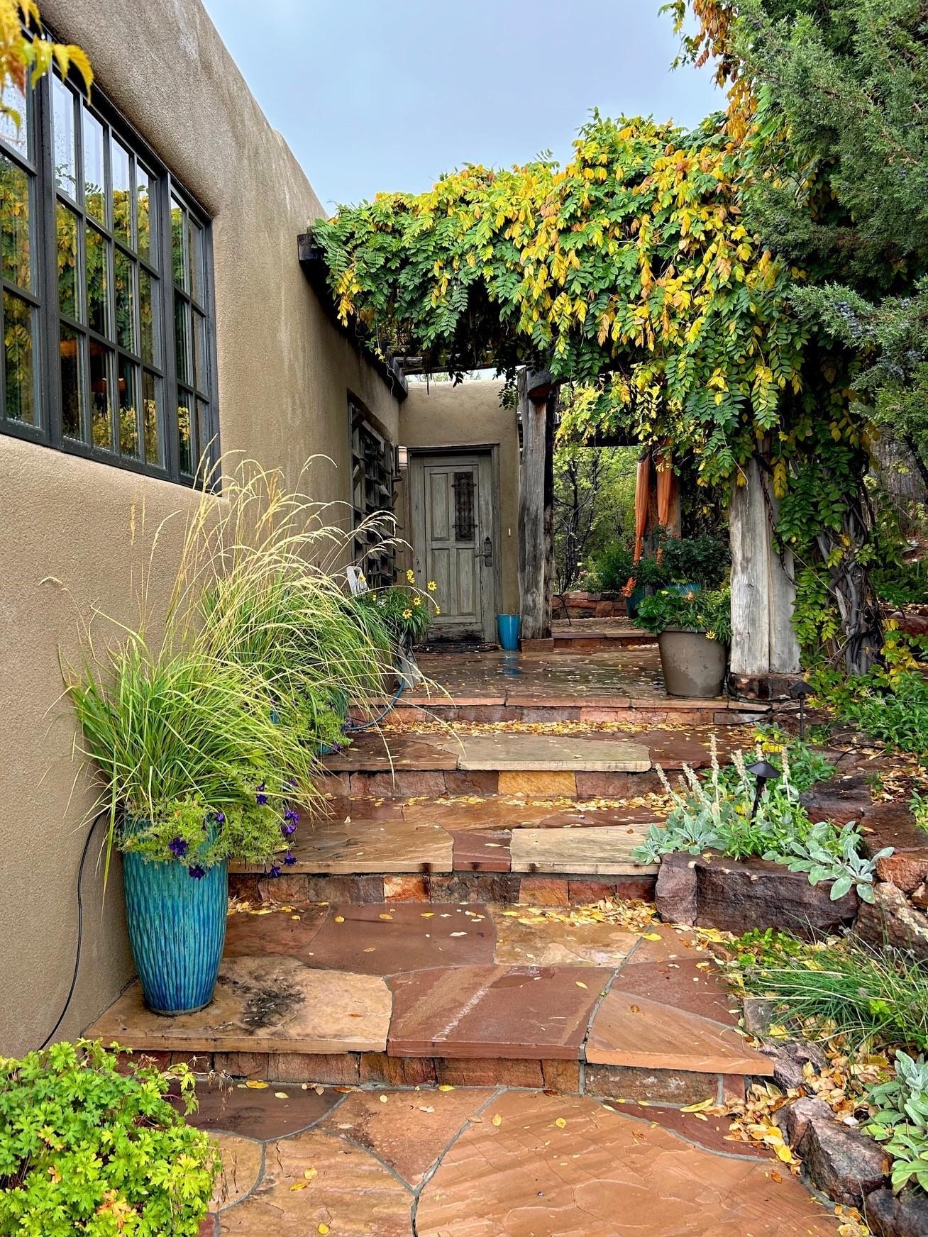 Situated on acreage in the Santa Fe foothills, the home is surrounded by native flora and fauna, and has numerous fruit trees on the property. Occasionally you'll see a herd of deer wander through, hawks soaring above or humming birds visiting the flower garden. You feel like you are far out in the country, as the home is on a gated dirt road, yet you are less than 1/8 mile from the pavement of Old Santa Fe Trail and only 8 minutes from downtown and the plaza.