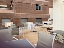 It has a large communal terrace on the top floor for sunbathing, a full bathroom and the kitchen you will find everything you need for cooking plus fridge, microwave, kettle, coffee maker, toaster ....
