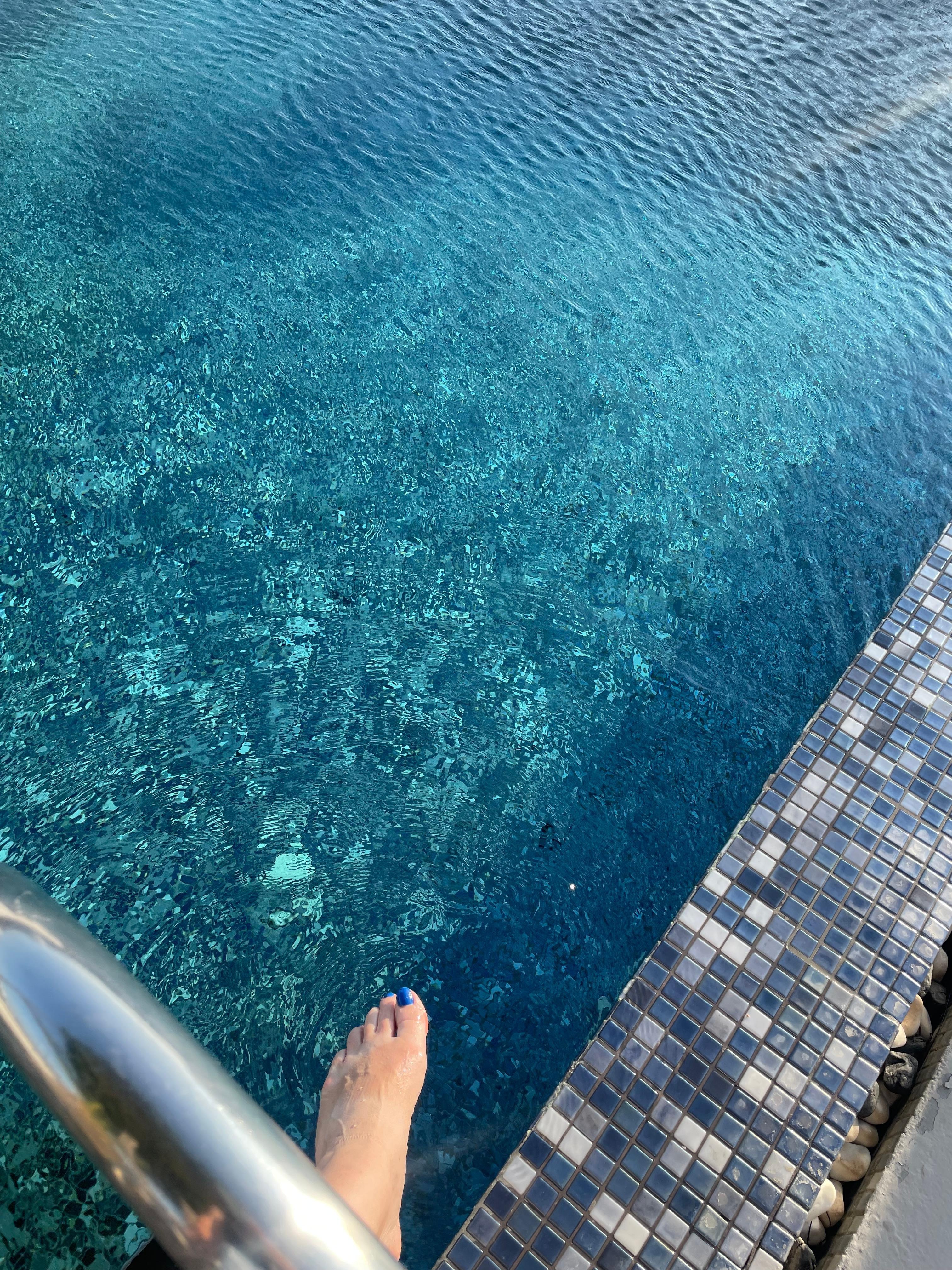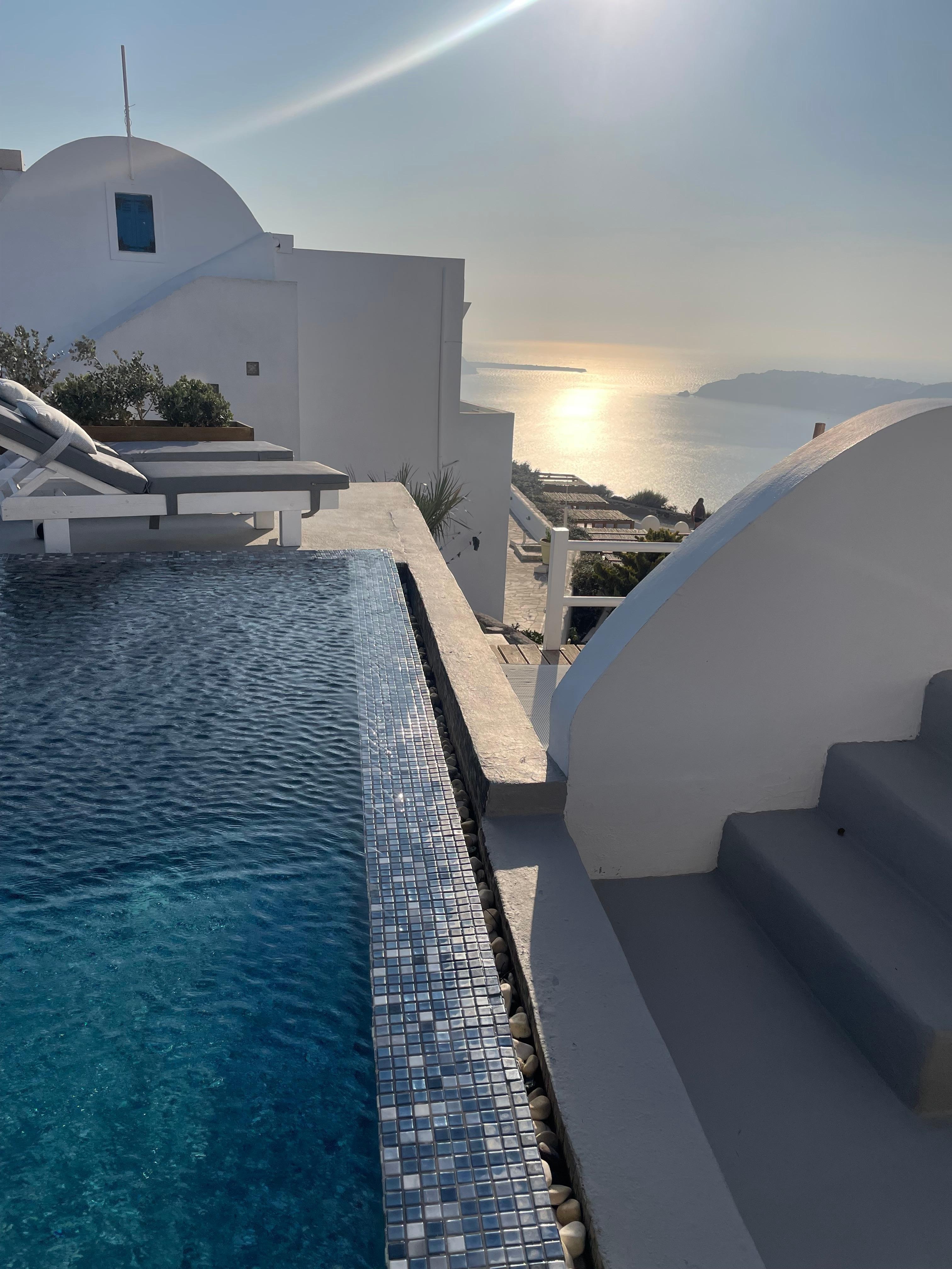 Outdoors there is a big dinner table available where you can enjoy your meals along with the magnificent view to the Caldera cliffs and the Sea. Next to that, you will find our amazing heated swimming pool which you can enjoy throughout the year! Sun loungers are available for your relaxation.
