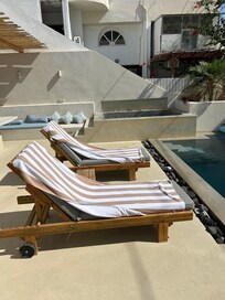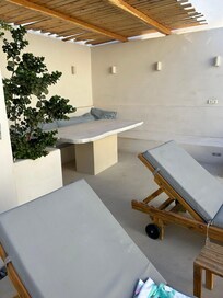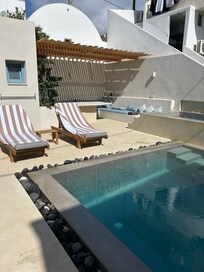 Absolutely beautiful villa, completed to a very high standard. Very modern and spacious no issues with one of our party being a wheelchair user. There are some small steps but our daughter was able to transfer no problem. Very well equipped inside and outside. The dining area is outside but is well covered and shaded. The pool was a big hit with us. There are 2 big double beds so be mindful if not booking for 2 couples unless you don’t mind sharing. The bathrooms are a very high spec and the host provided complimentary toiletries and towels.The property was exceptionally clean and so were all the towels and bedding (lots provided) the air conditioning is a godsend as we visited in August. The teenagers were impressed with the WiFi and the TV.The villa is situated approximately 15 minute walk to the sea front and via lots of lovely shops, bars and restaurants. There is a good supermarket 2 minutes walk away. Downhill to the front but uphill coming back.Local taxi service is excellent and the host has lots of suggestions for visits and excursions however we were there for a family wedding and already had a full week of festivities scheduled. We fell in love with the island and Kamari and we will definitely be back for a more relaxing holiday in the future. Thank you to our wonderful hosts.