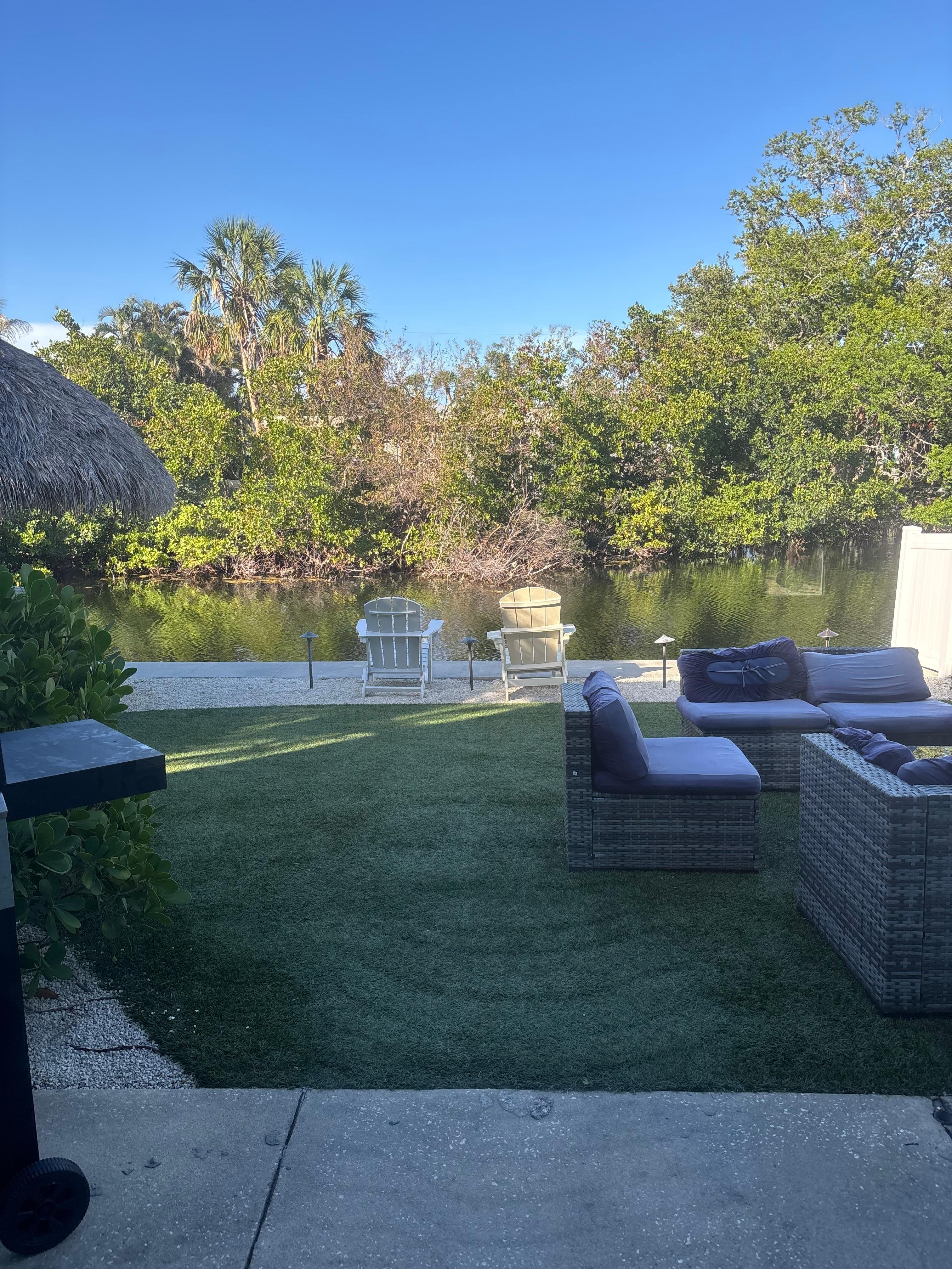 Relax outdoors in your tropical backyard, complete with a cozy Tiki hut and comfy lounge area for unwinding in the shade. Or enjoy your private saltwater pool in the front yard, enhanced by a Tiki umbrella and seating that invite you to soak up the island vibe. The pool area also offers water views, lounge chairs, and a dining table for breezy meals. Fire up the grill for a family cookout or sunset dinner. Explore nearby beaches, water activities, and local shops, all within a short walk or trolley ride. The outdoor patios and canal views create an island paradise for relaxing and entertaining