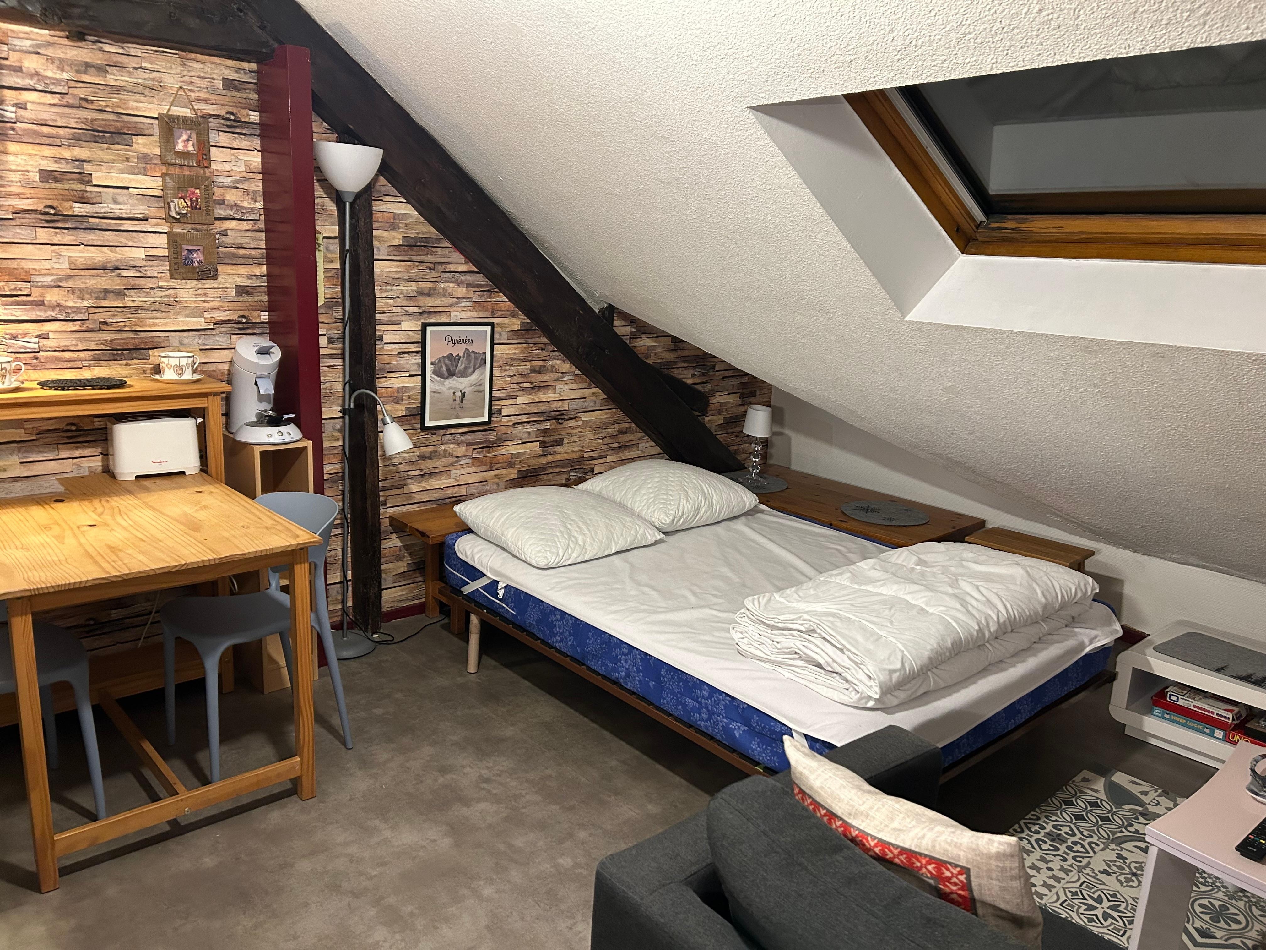 rental for 2 to 3 beds maximum (2 adults and 1 child) located on the 3rd and last floor, .. the studio is 35m² on the ground 15m² Carrez law it has a 140x1 bed. 90 with duvet or blanket, a fixed sofa and a single bed with duvet or blanket, towels and bed linen are not provided. the bathroom has a bathtub, sink and wc ... in the hallway entrance with a large cupboard, the kitchenette is equipped with a microwave, oven, fridge, normal coffee maker and senseo coffee maker, toaster, fondue raclette, dishes etc, tv. vacuum cleaner, in the DRC a ski rack, free parking is right next to the residence, no need to take your car, the cable car is about 300m, the Caesar thermal establishment is 100m as well as the thermal baths center les bains from the rock, the swimming pool, the ice rink, the cinema, the bars and restaurants are nearby, the 3-week cure package is € 490 excluding shelter costs.