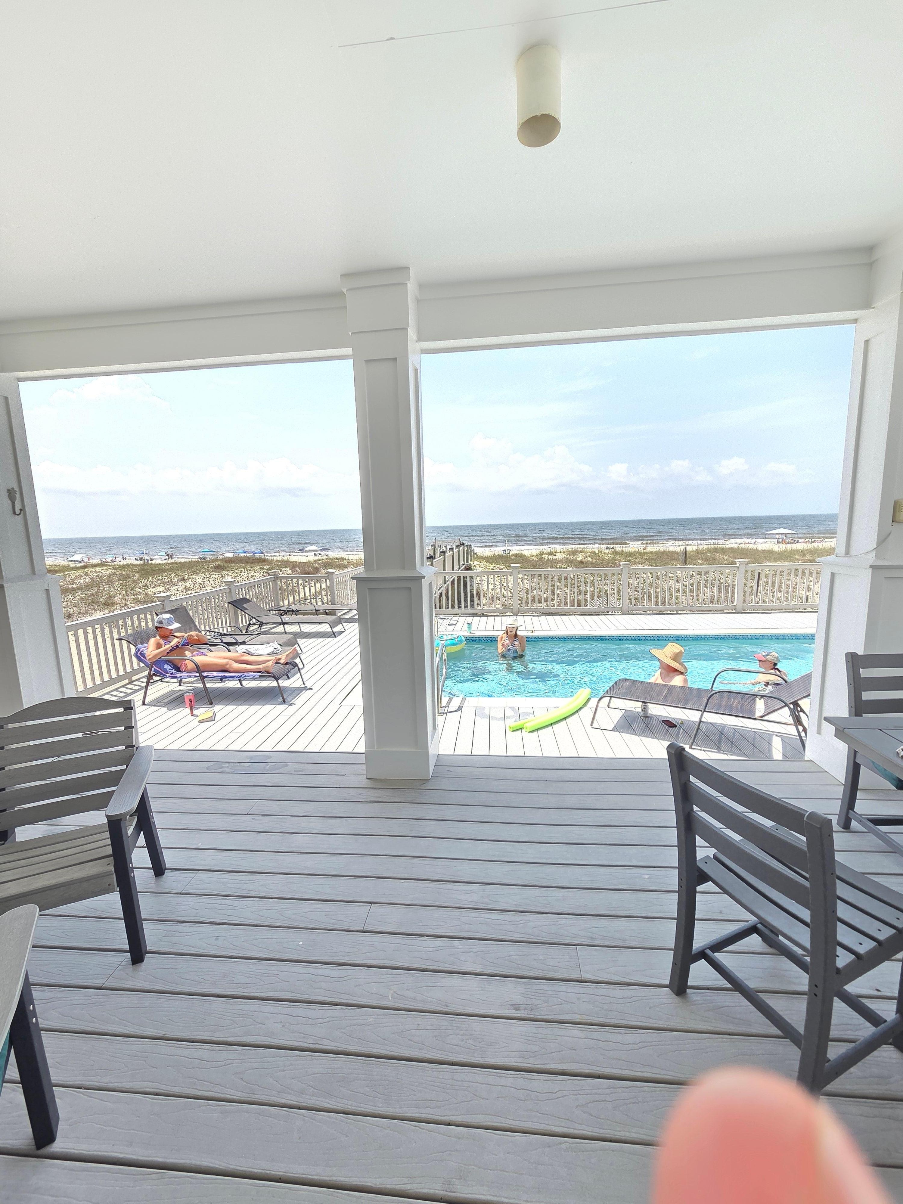 Situated on the white sand beach of Gulf Shores, Alabama, this beachfront home has everything! Not only is the ocean a few steps from the door, but there is a private pool on the spacious deck! Inside the house there is room to stretch. Downstairs are two living areas, a double kitchen (2 of everything) with a large pantry and ice maker, 2 large dining tables seating 10 each, and additional seating at the large island bar. Also, on the main floor are 2 bedrooms with king beds and en suite baths. Completing the main floor are a half bath, a laundry, and a wet bar (with an additional ice maker). There are plenty of large windows in the living area which offer beach views while never leaving the house!