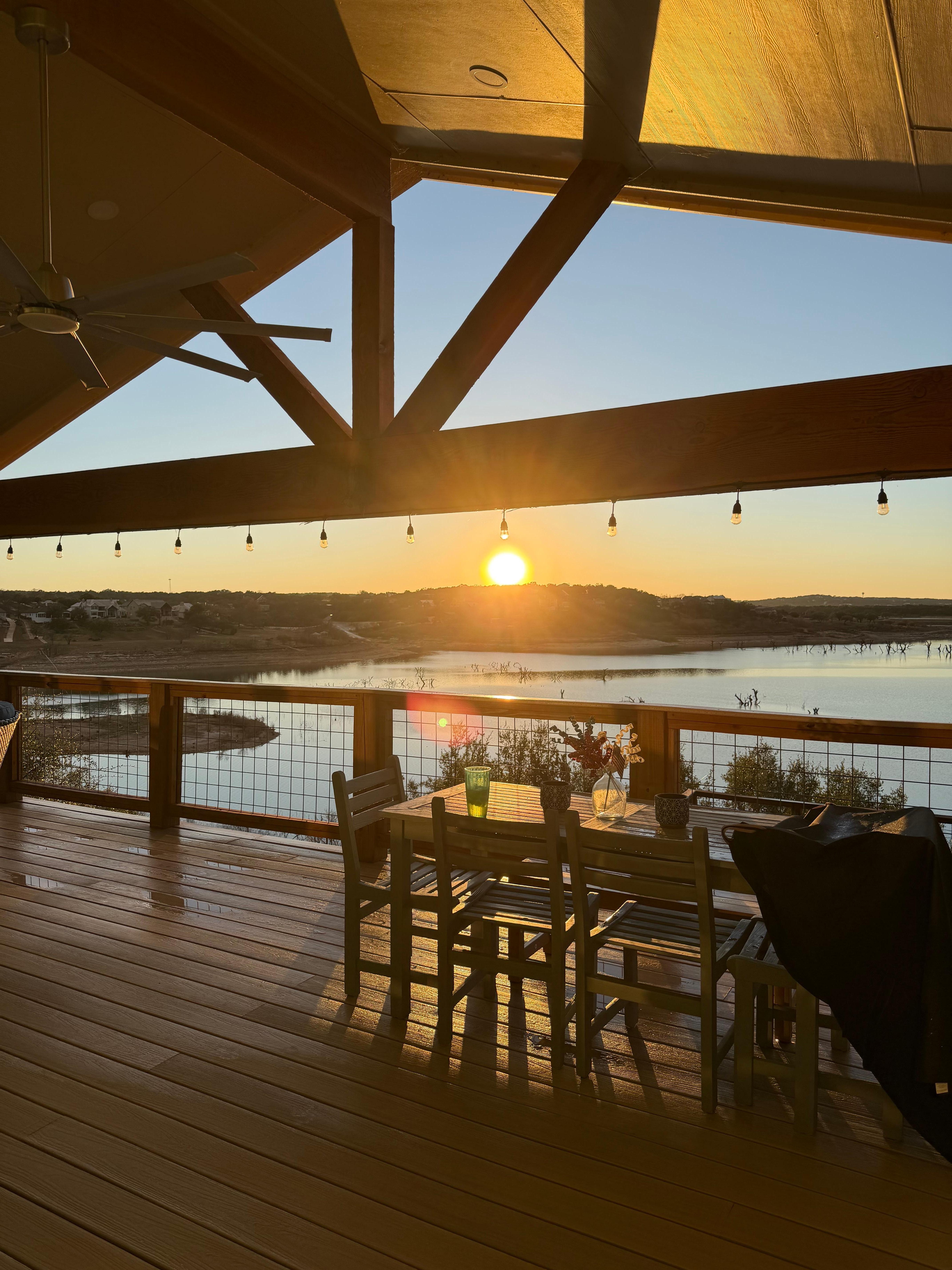 1) Spacious porch overlooking Canyon Lake, connected directly to the house with an overhead 84 inch ceiling fan hung from the vaulted ceiling covering the 575 sf deck well furnished with comfy rocking chairs and dining table/chairs that seat 6+. Again, all overlooking Canyon Lake.