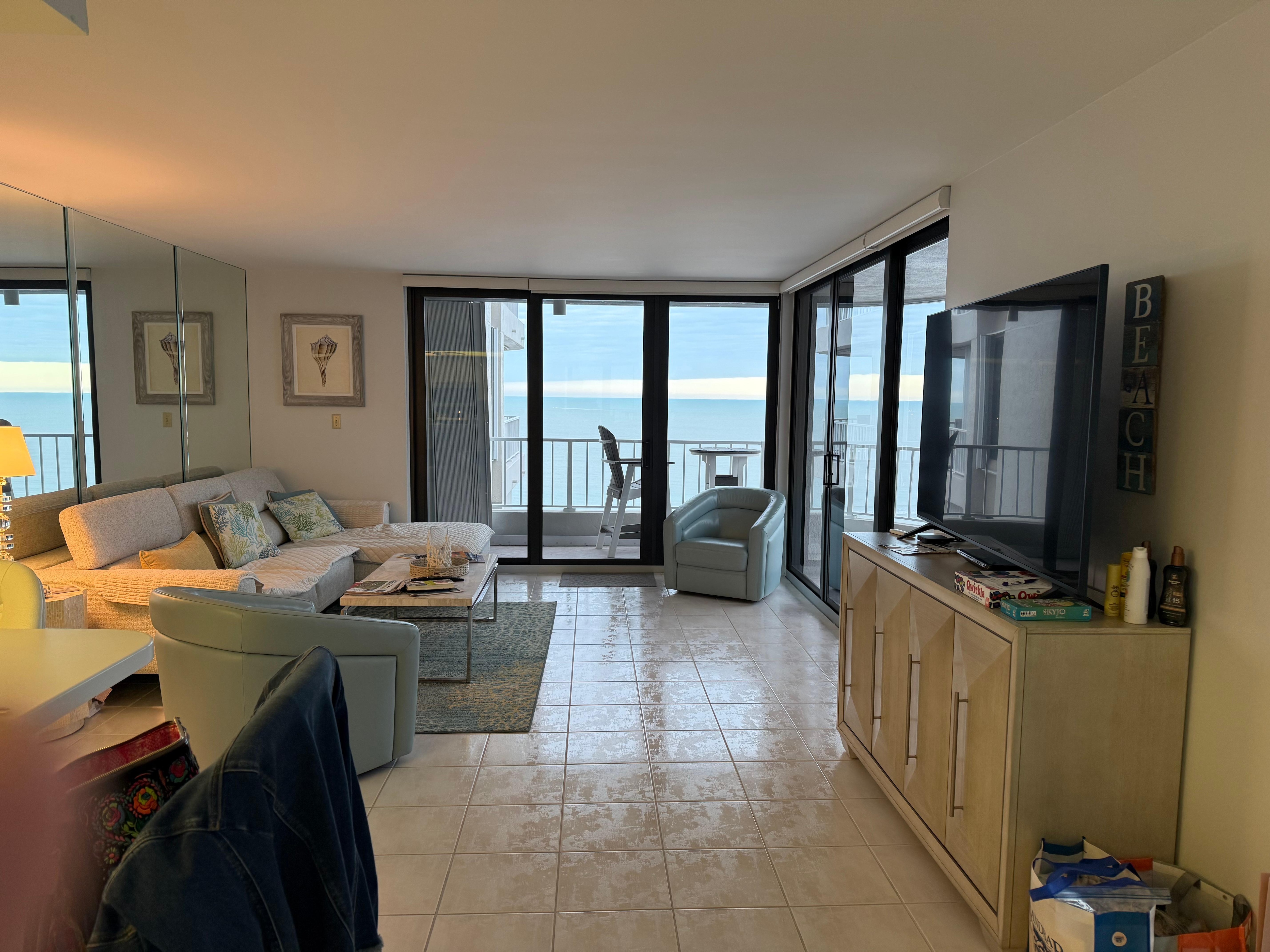 The Master Bedroom has new furniture with new carpeting and a king size bed. The Guest Bedroom has also been renovated with new carpeting and furniture. Remote controlled ceiling fans in both bedrooms. There is also a ceiling fan in the kitchen. High Speed Fiber Wi-Fi is free and included for your use during your stay. TV’s are located in each bedroom as well as the living room. Master and guest full bathrooms each have tub with shower. You will have access to a dedicated parking spot in the main upper covered lot, beach chairs and tent/umbrella, gorgeous pool with storage shed for the beach chairs, workout facility, New tennis courts & clubroom.