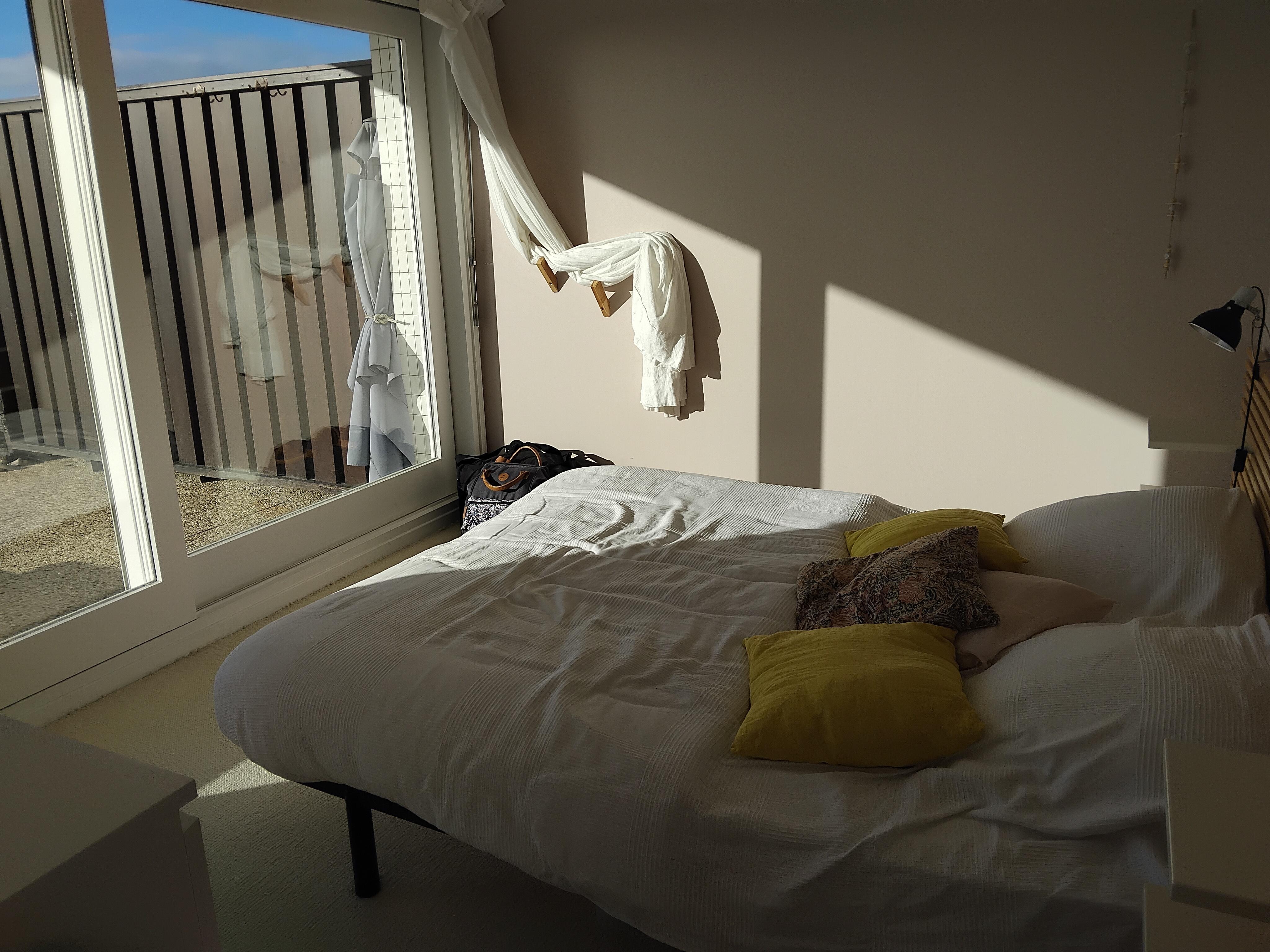- bedroom adjoining the living room with large picture window overlooking the terrace: a 160/200 bed, a chest of drawers and two bedside tables