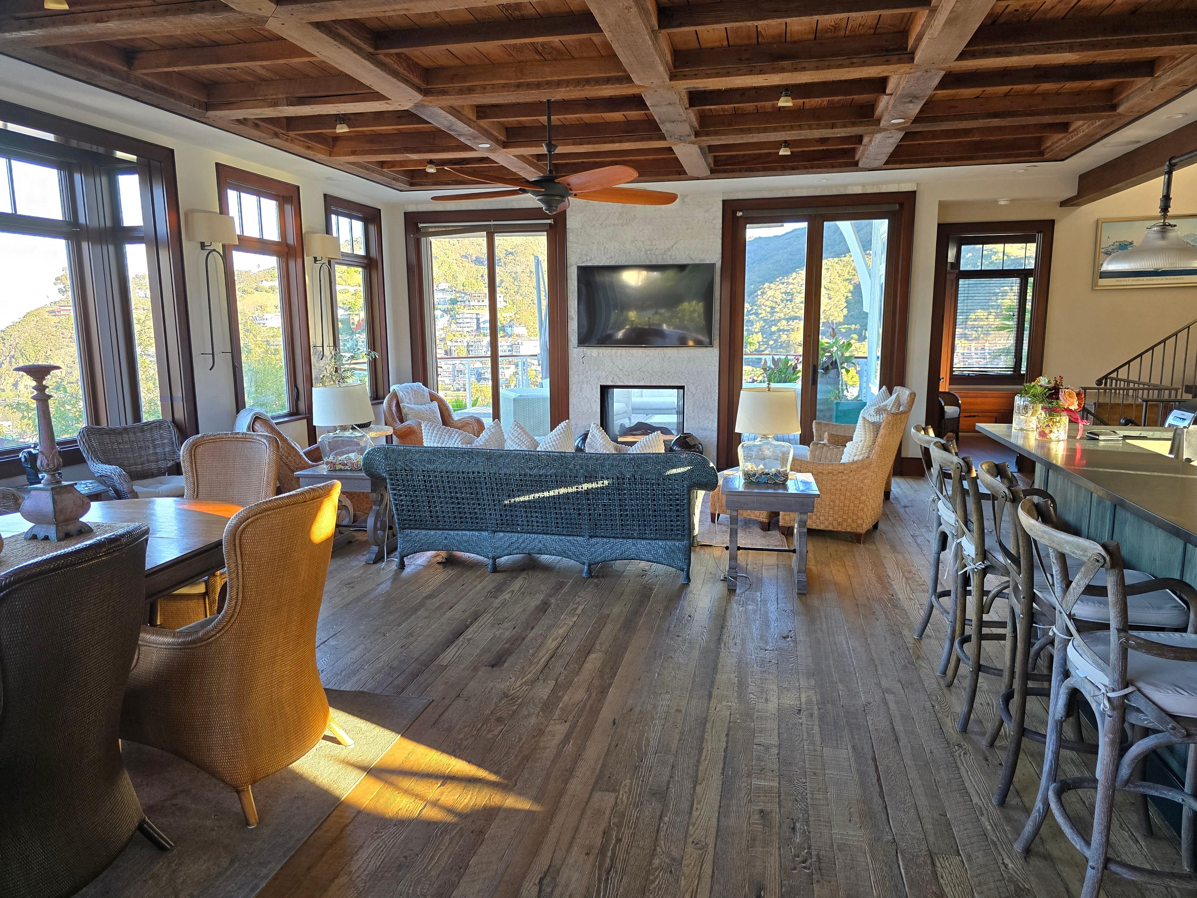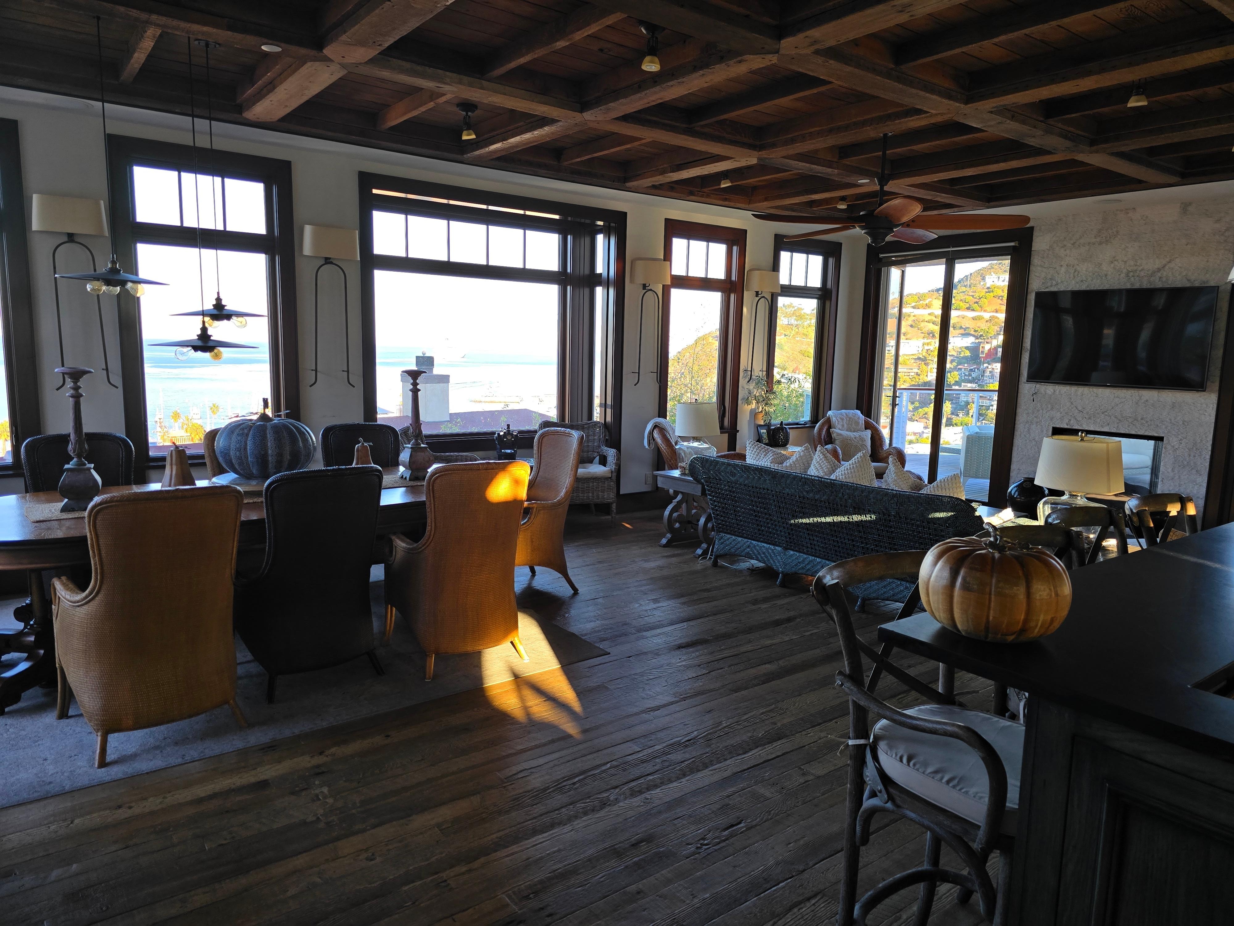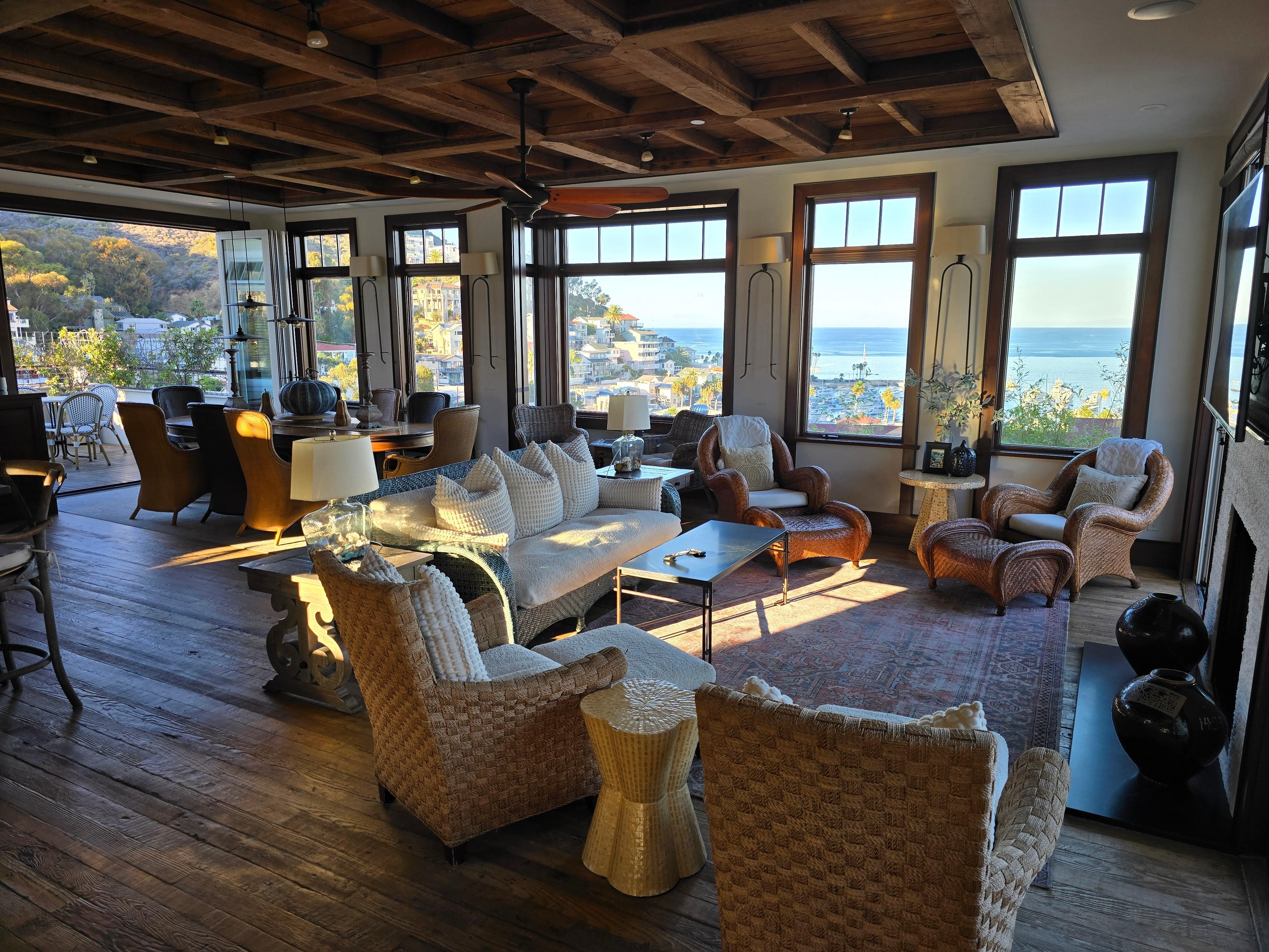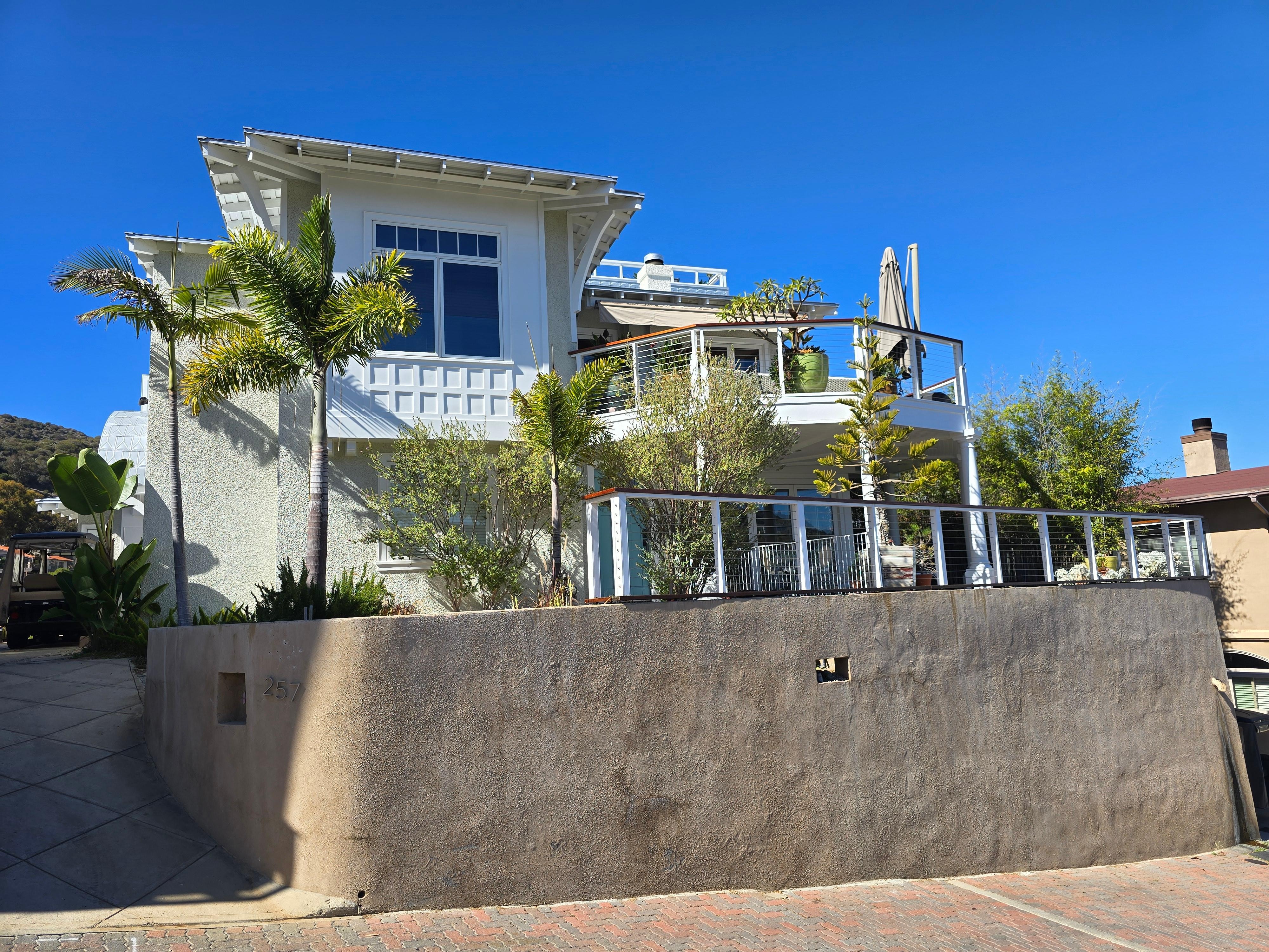 New 280 degree top floor view unit, features views of Avalon harbor and the village of Avalon including the Casino. 3 bedrooms, 2 king, 1 queen, all with own suites. Kitchen includes new stainless Bosch appliances, Soap stone and stainless steel counters, hardwood floors. There is also our laundry room with 2 bunks with porthole windows. A powder bath adjacent to great room. Decks for relaxing, sun bathing and bar-b-que, makes this an ideal for a get away for your entire family. Centrally located with just a 5 minute walk to downtown. Fully furnished with 5 tv's and Direct TV, Internet, fully equipped kitchen ware, linens.