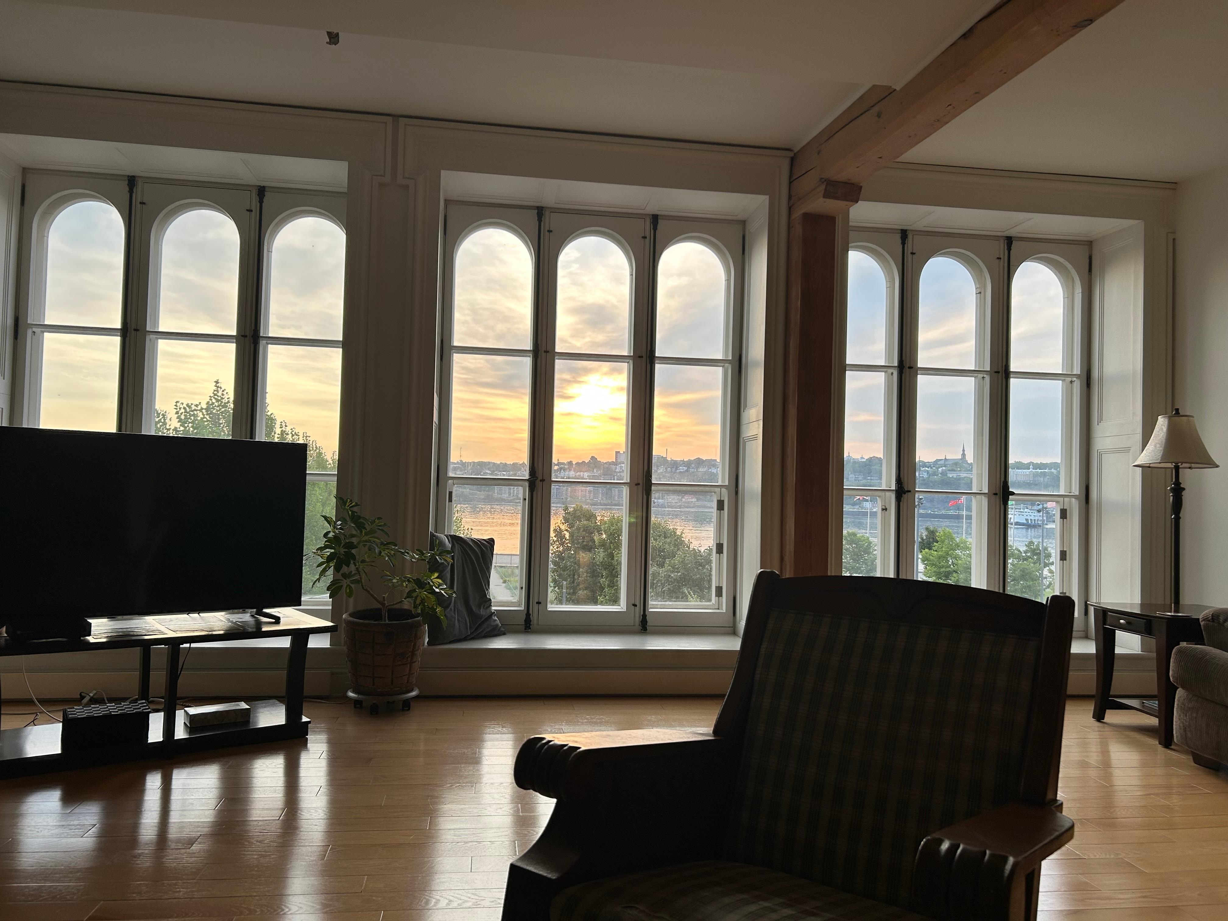L'appartement La Corriveau (renamed in memory of Madame Claude Corriveau-Biron-1943-2017, co-founder and beloved wife of Mr. Grégoire Biron, current owner of the Royal Dalhousie. Also a reference to Marie-Josephte Corriveau, better known as la Corriveau, a popular figure in Quebec folklore) is located on the 3rd floor of the Royal Dalhousie building. With its large open common areas, magnificent bay windows offering breathtaking views of the St. Lawrence River, hardwood floors and gray stone wall, this unit is sure to meet your expectations.