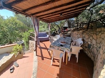 Wonderful villa, near the sea, Villasimius-Geremeas area, Località Baccu Mandara, 700 m from the sea. Surrounded by a beautiful and lush garden with Mediterranean vegetation in which the swimming pool is obtained which enjoys absolute privacy. Independent unit on the first floor with