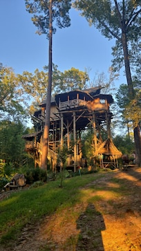Property is private located on 250 acres of mature forest with four lakes. There is a jungle garden with canals and African Queen type riverboat. The treehouse is 35 feet in the air accessible by staircase and a separate luggage and supply lift. The interior has central air and heat, WiFi, Cable TV, Sonos Sound System full modern kitchen, master bedroom with private balcony, tile bath with heated floor, tile shower, bidet, washer/dryer; there is a loft bedroom with two bunks and space to place an additional air mattress. There are three porches overlooking jungle gardens and ten acre lake. Lake DeGray State Park is 15min drive and Caddo River 5 mins. Camp Winnamocka is located at opposite side of the property with a frontier stockade fort, pirate ships, ropes course and Native American Village. There are five miles of wooded nature trails to enjoy privately. The property is five minutes from Interstate 30, one hour south of Little Rock 35minutes from Hot Springs. The Treehouse does have a five guests limit.