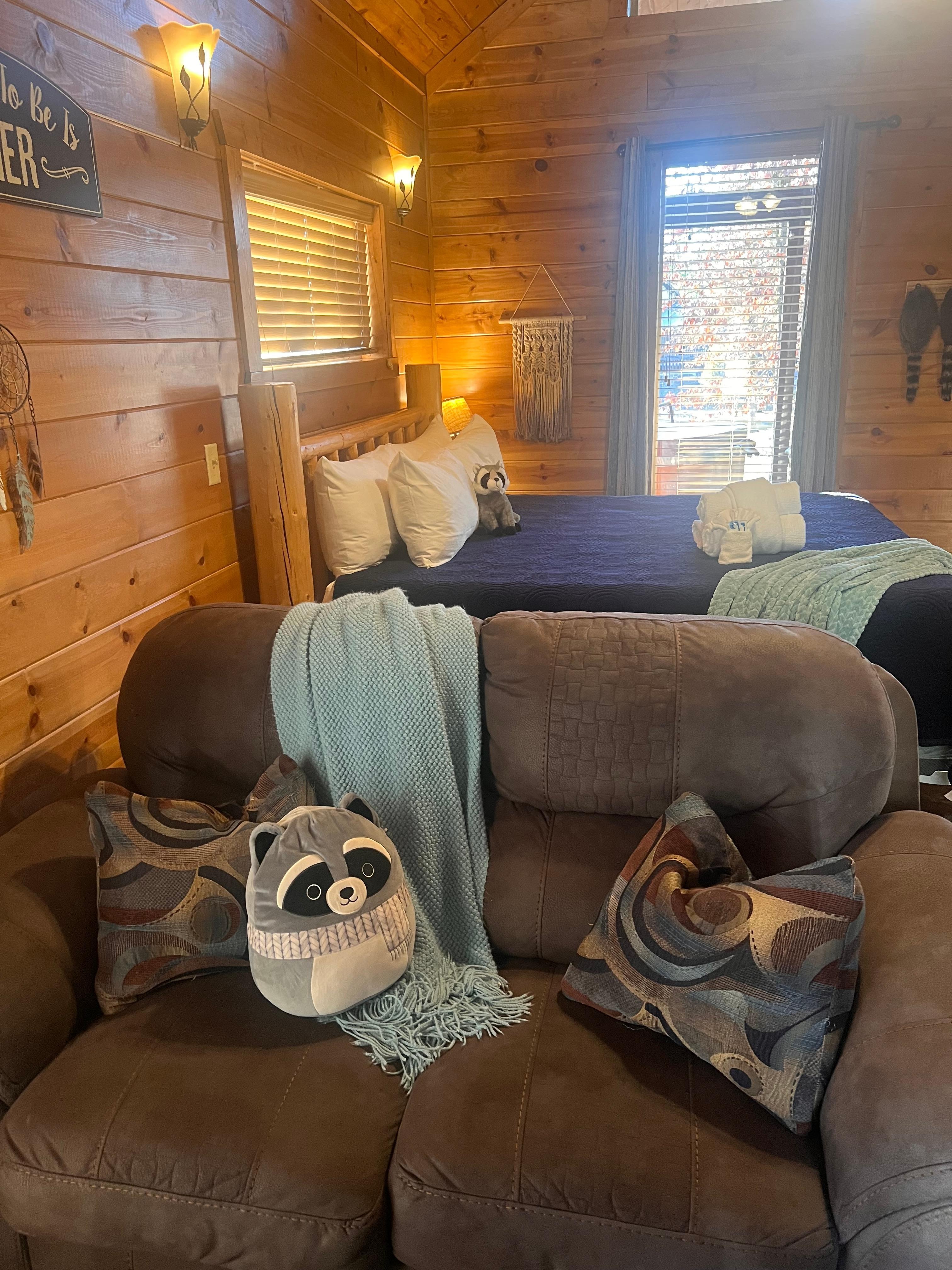 Rowdy Raccoon is a perfect, couples retreat. The comfy and cozy King bed and indoor gas fireplace offer romance! Enjoy a movie on the large flatscreen TV with DVD player and Direct TV programming.