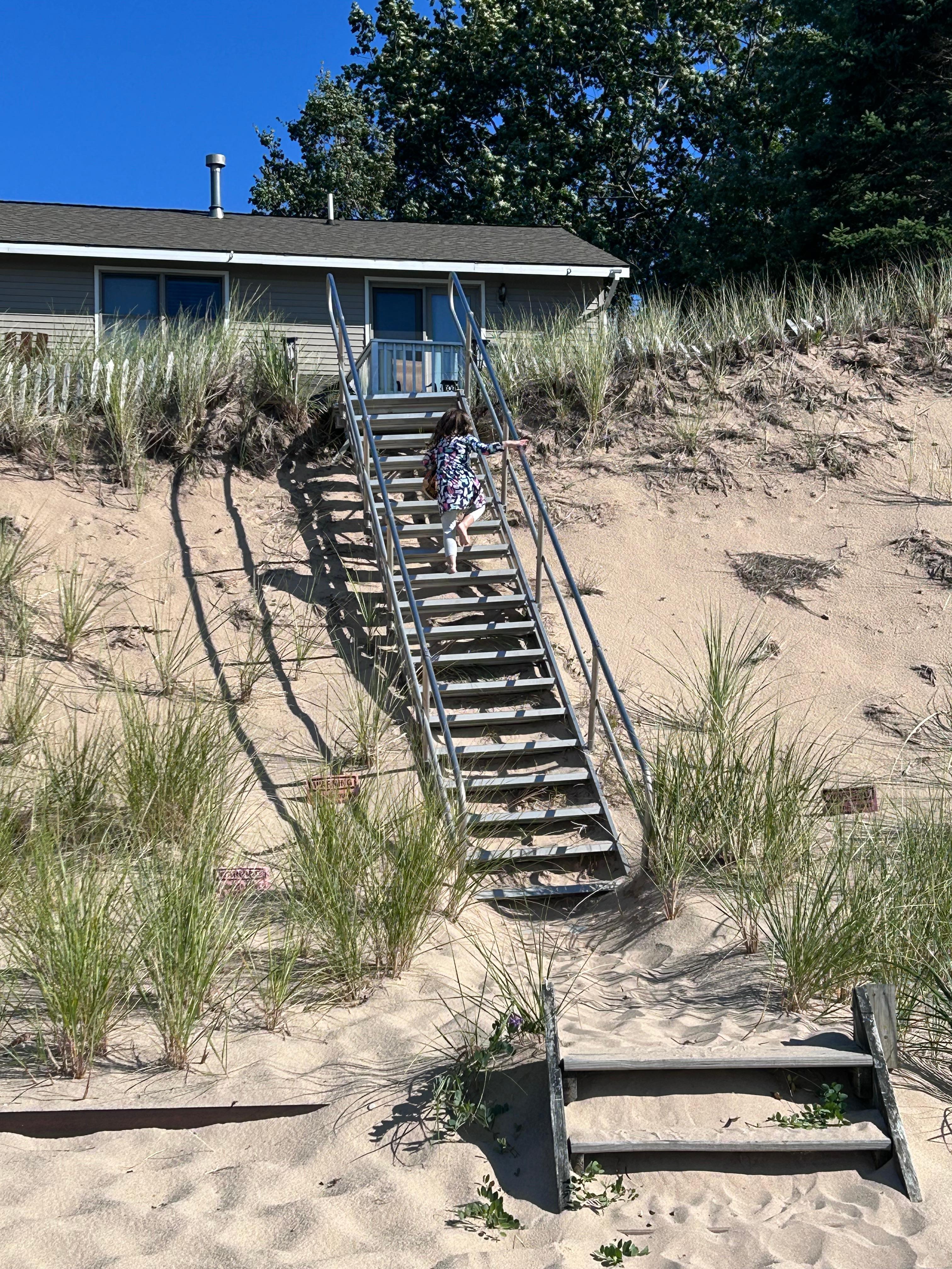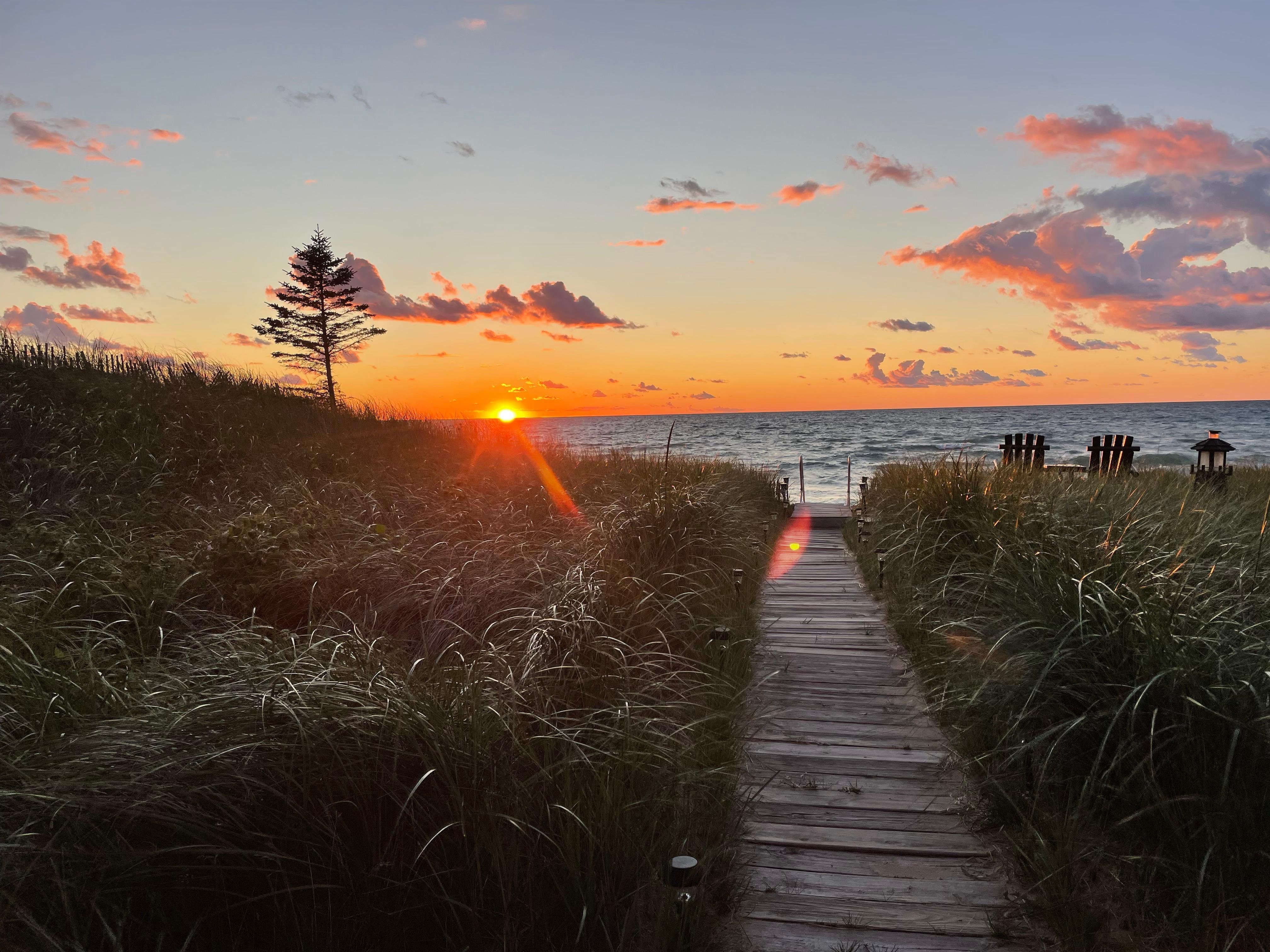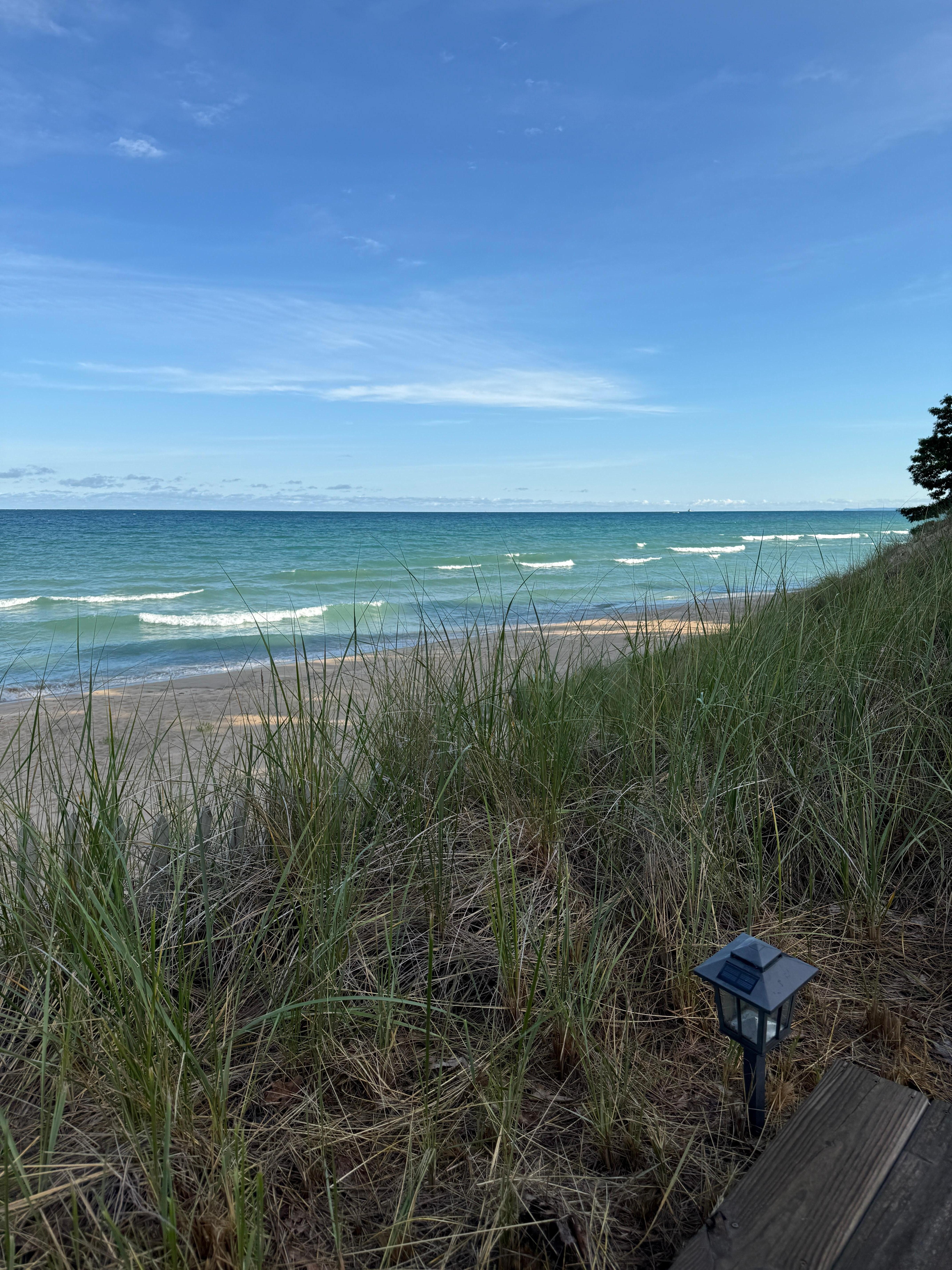 This property is a little slice of heaven. Steve, the owner, was friendly, kind, and responded promptly to all of my questions. The house and its views are even more stunning in person than the photos can capture. It’s modern, spotless, and well cared for. Everything you need for a comfortable stay is provided. It’s like you’re staying at your grandparents’ house and they’ve stocked it with everything you might need. It has Tommy Bahama beach chairs, two umbrellas (shade for 3 people), a super-clean gas grill, and new appliances (stove, fridge with ice/water, washer, dryer). The Wi-Fi easily handled our group of nine, even with three of us working remotely. All three upstairs bedrooms have lake views, and the main floor offers panoramic views of Lake Michigan. The beach is clean, quiet, not a lot of foot traffic, and everyone I met (neighbors and those on the beach) was friendly and kind. You can walk/run for miles along the clean, sandy shoreline. We hunted for rocks and found beach glass, a lightning rock, and even Petoskey stones. Sunsets from the porch were incredible, and we had a few clear nights perfect for stargazing. One night, we even saw the Northern Lights! The west-facing porch is spacious, shaded, and has plenty of comfortable seating for everyone. This place is incredibly peaceful—like spending a week inside the Calm app. I wouldn’t hesitate to stay here again.