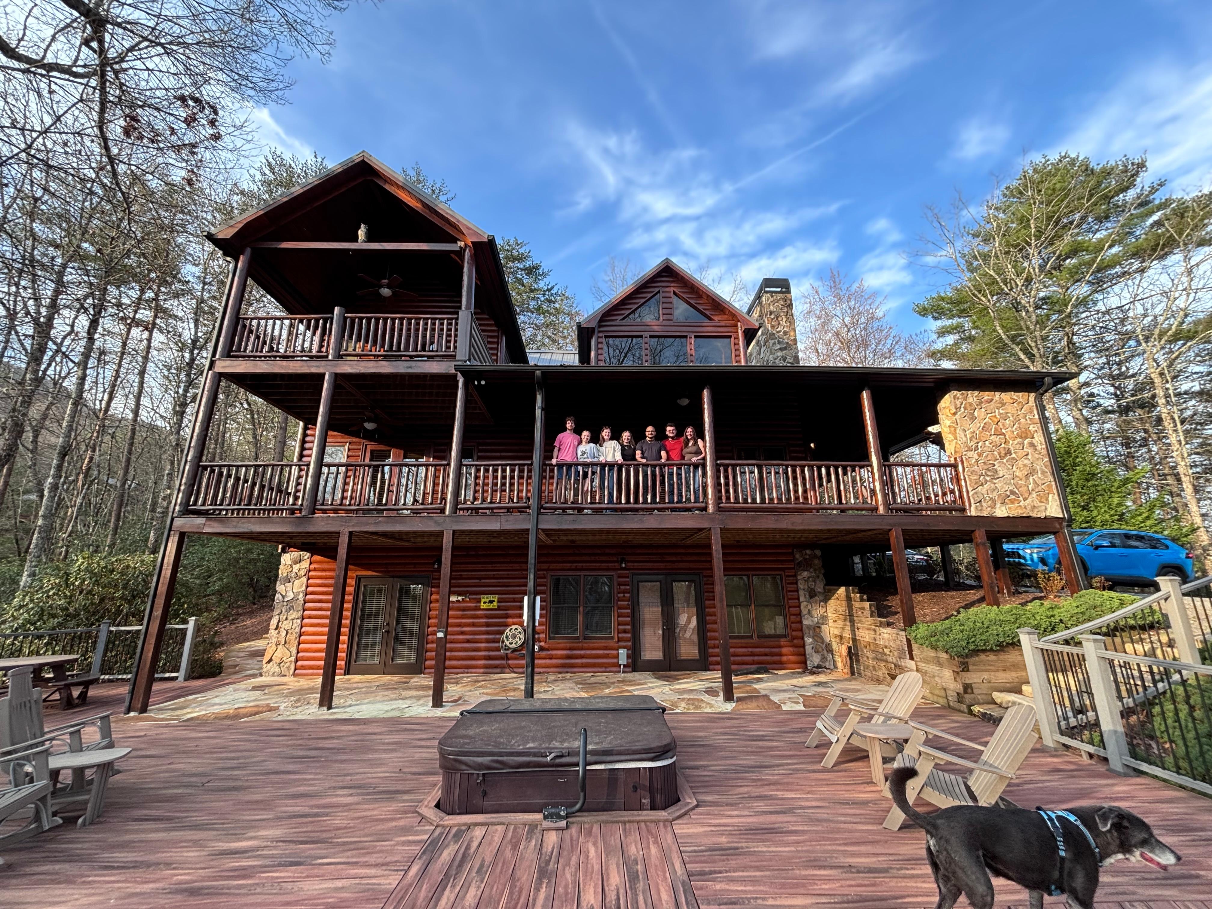 The cabin is beautiful, clean, close to downtown, and provided ample room for our five couples to celebrate a birthday weekend. The kitchen was well stocked and allowed us to cook several meals, inside and on the gas grill. The indoor fireplaces kept us nice and cozy with large windows to enjoy the scenery. Unfortunately we were unable to use the outdoor fireplace, as it was in need of repair. While that was a great disappointment, we are thankful the property was thoroughly inspected before our arrival and notified us before we attempted to light it. We did enjoy a campfire in the very nice and well lit fire pit. The porches and deck were huge and very clean. Although the outdoor temps were too close to 0 degrees for us to brave the hot tub, we did peek and it looked to comfortably seat 8 people and set at 100 degrees. Overall it was a great cabin and definitely recommend for large parties.