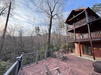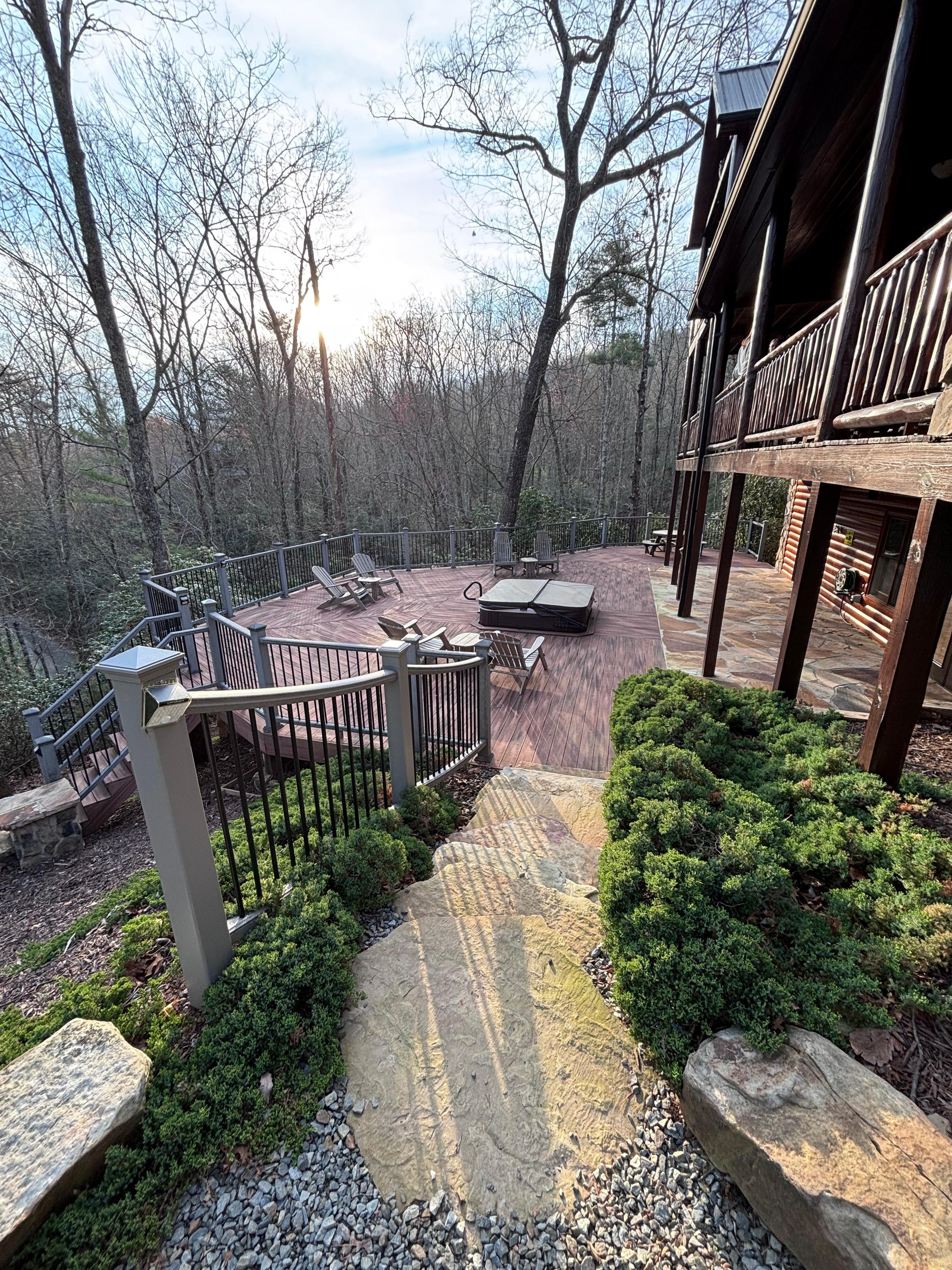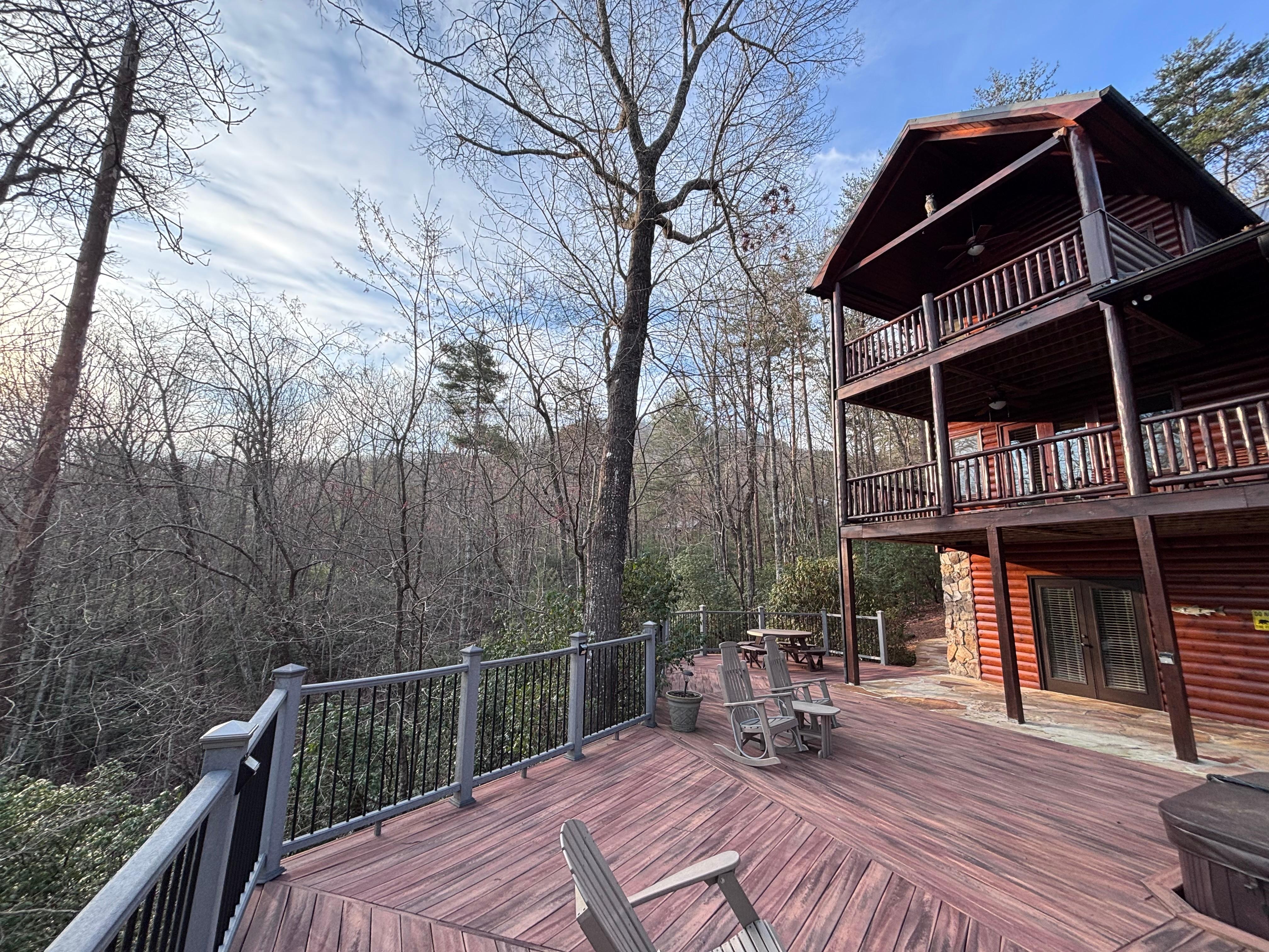 The main level's huge wraparound deck is perfect for outdoor entertaining. Grill the Georgia trout caught earlier from the Toccoa, and share stories around the decks. On the lower deck, relax under the stars in the sunken hot tub or enjoy a nightcap on the Adirondack chairs.