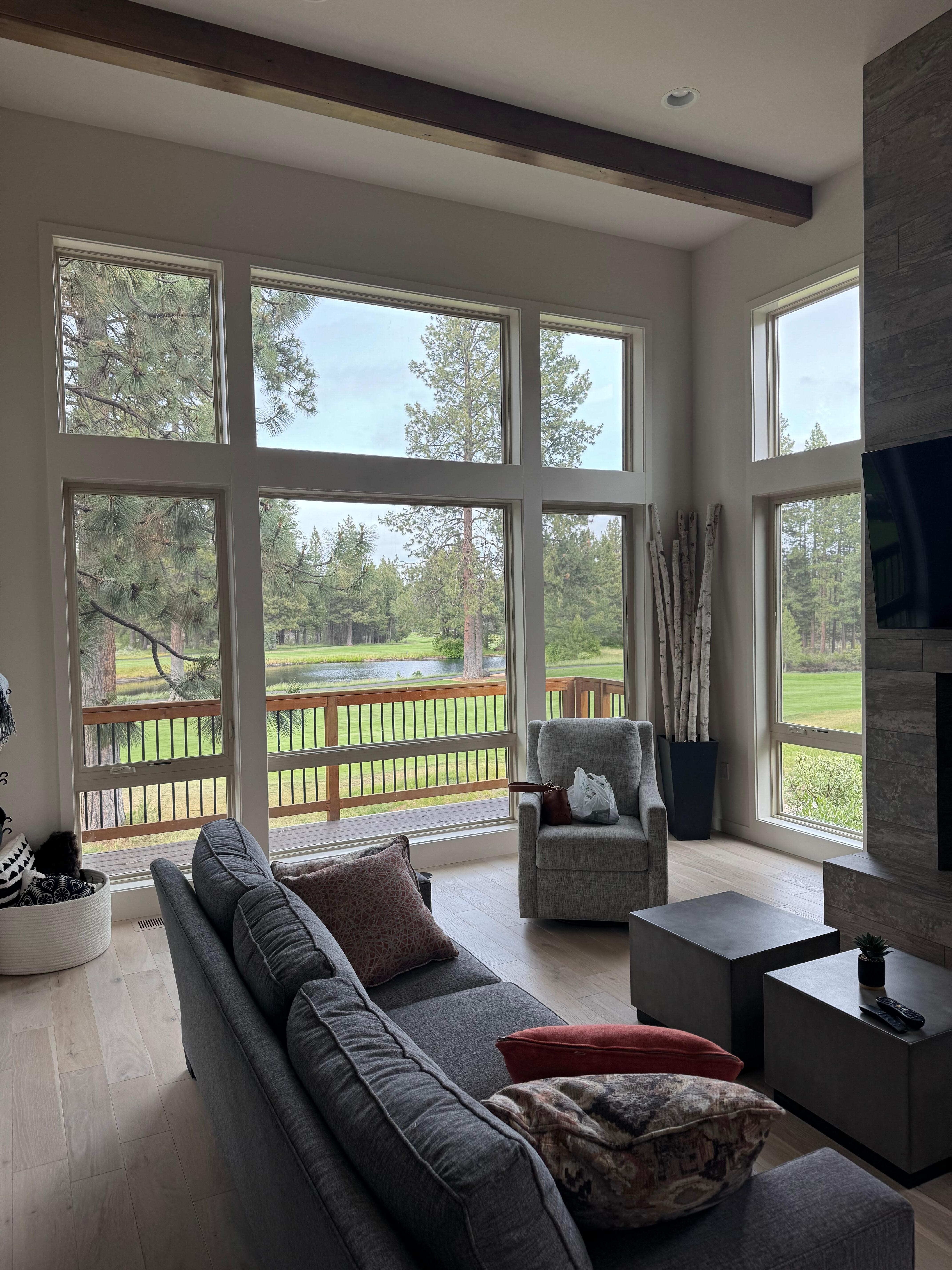2 private King Master suites w/ spectacular bathrooms and huge closets include all-new luxury bedding, along with a stylish bunk room (and another private bathroom) that sleeps 2 additional adults or 4-6 small children. Gorgeous, light-filled living room with 18 foot ceilings, custom furnishings and alder crossbeams. Large cook's kitchen with a huge marble slab island and sparkling new stainless appliances. Dining room on the 1st floor seats 8, with huge floor-to-ceiling windows and a comfortable covered deck with new natural gas grill and seating overlooking fantastic golf and forest views. PLUS a second huge family room with another private deck upstairs!