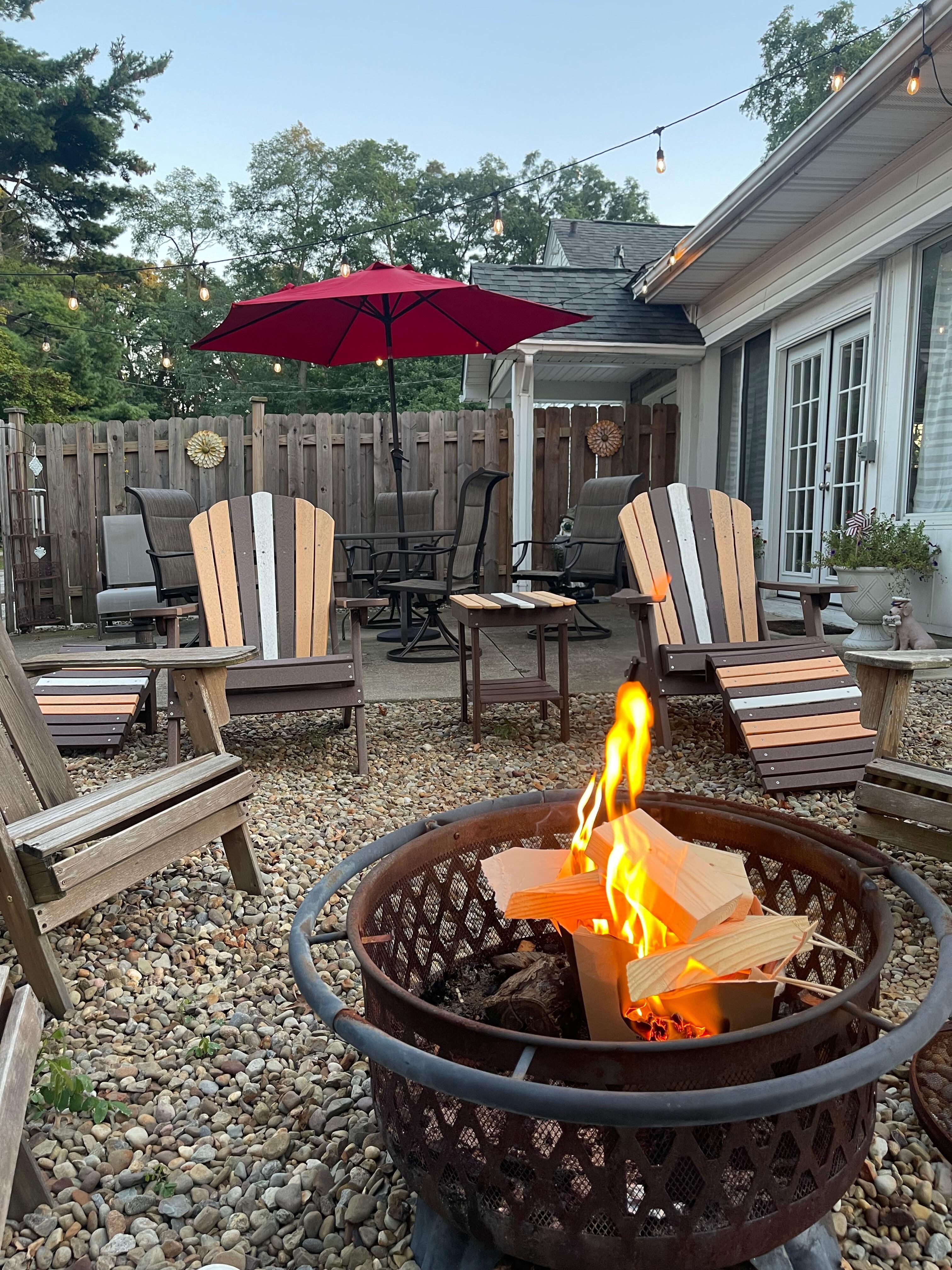 - Patio with lounge seating and a fire pit (firewood provided)