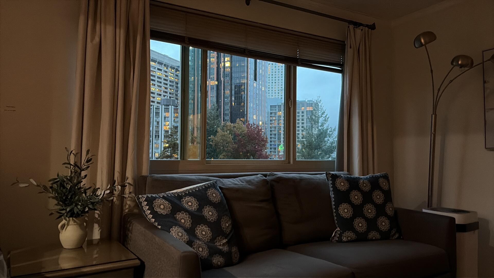 You will feel cheerful and warm staying at this 574 sq ft apartment on the 11th floor of a classic Seattle building. The living room is decorated with lively colors and furnished with multiple comfortable seating arrangements. The king-sized bed with soft linens makes it so easy to stay in bed longer. A queen-sized sleeper sofa is available for friends and families. The kitchen is fully equipped for cooking your own meals or storing and re-heating leftovers from one of the many nearby establishments.