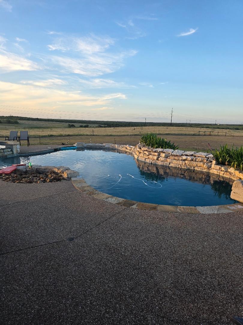 Our home has three bedrooms each with its own private bath. We have a massive great room with a wood-burning fireplace and two sofas, a huge fully stocked kitchen. The kitchen opens to a large dining area surrounded by windows looking out to a beautiful view of the countryside. There are two half baths and a game room complete with a daybed and trundle, billiards, foosball, and board games. The large backyard is complete with a pool, hot tub, outdoor kitchen/bar, fire pit, and amazing sunsets. In the evenings, you can hear all the sounds of nature and enjoy a spectacular view of the stars! The space is perfect for family vacations and gatherings, bridal showers, and small weddings at additional pricing. We are secluded while still being near all that Downtown Waco has to offer including Magnolia/The Silos, Backyard Bar Stage and Grill, Baylor University, BSR Cable Park, Heart O’ Texas Extraco events center, Battle Lake Golf course, and Tradinghouse Lake. There is plenty of room to park your boat or sit on the back porch and watch the cattle roam on neighboring acreage! Space is available for stalling horses and livestock with plentiful trailer parking! Come sit a spell!!