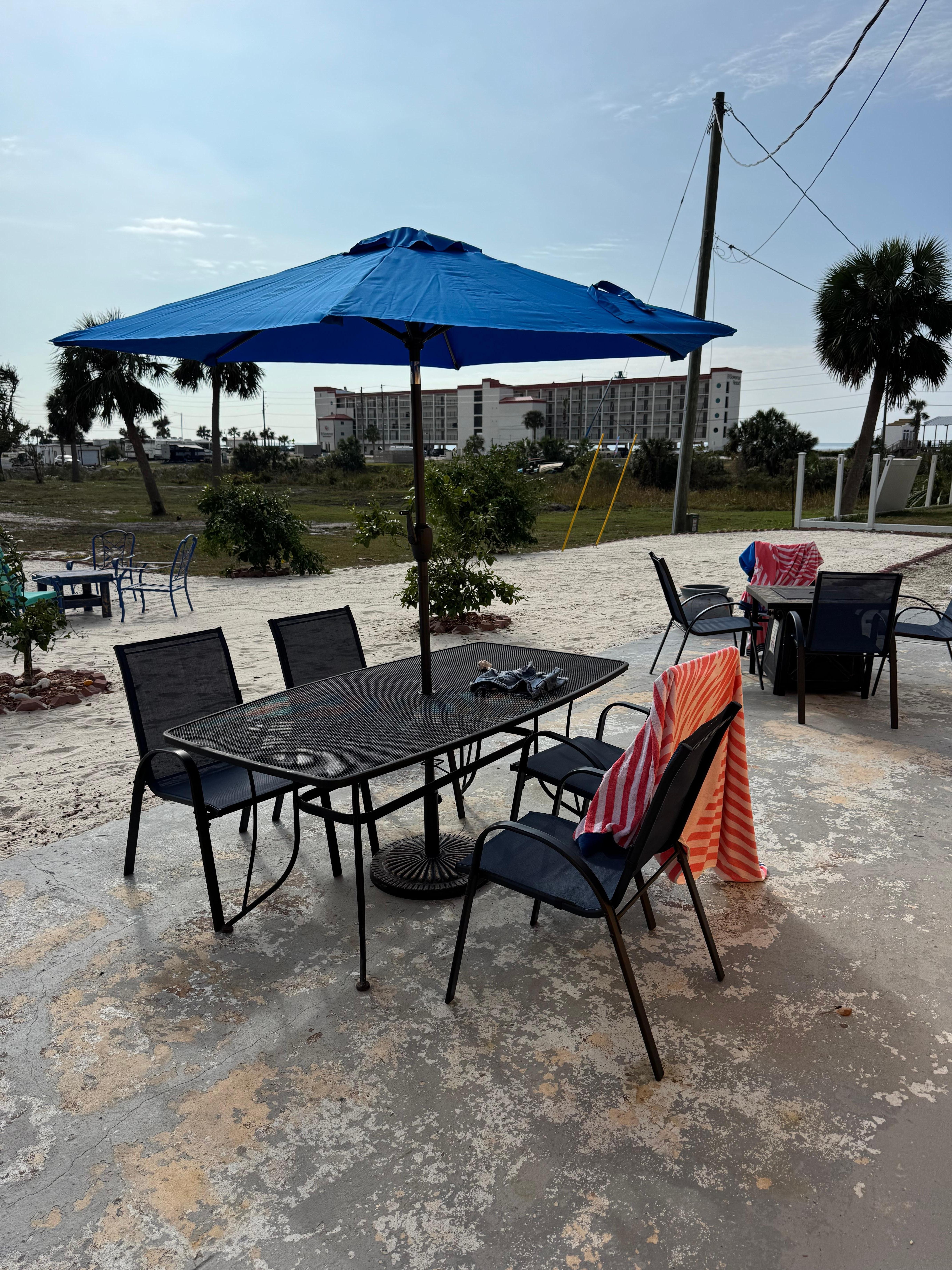 We have newly converted our backyard into a beach vibe, plenty of seating, an umbrella that can light up the evenings along with firepit for cozy evenings.