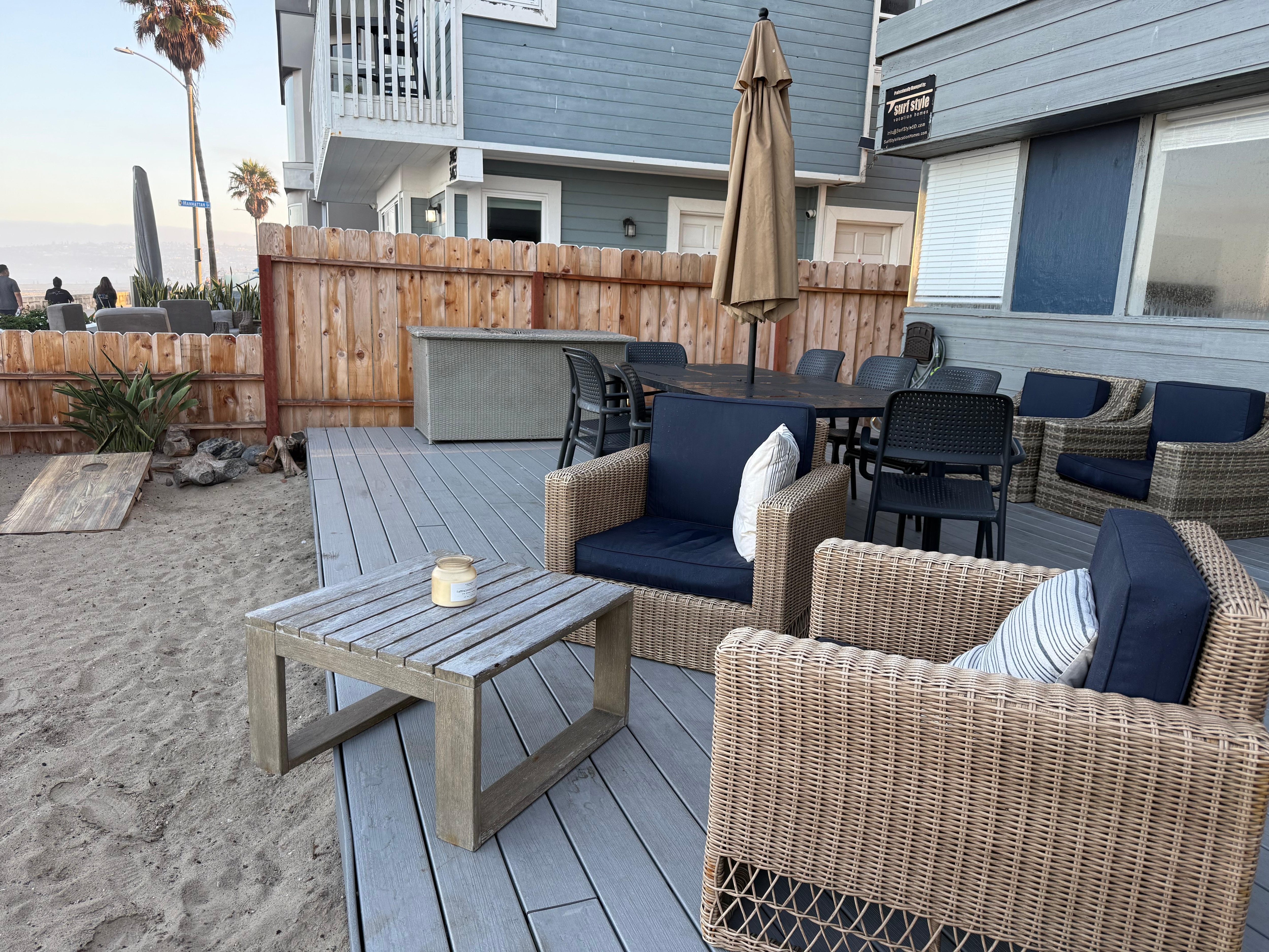We had the best thanksgiving at this beach house! All the furniture felt new and there was plenty of seating for our family of six. Our children had a blast playing in the sand area, and my husband & parents enjoyed sitting outside on the deck, which also had a shade umbrella. The location was 5 stars, right on the ocean and easy walking to pretty much everything in Mission Beach. Our only recommendation is a few more pots & pans (there was a full set but we needed a bit more for Thanksgiving dinner, ha!).