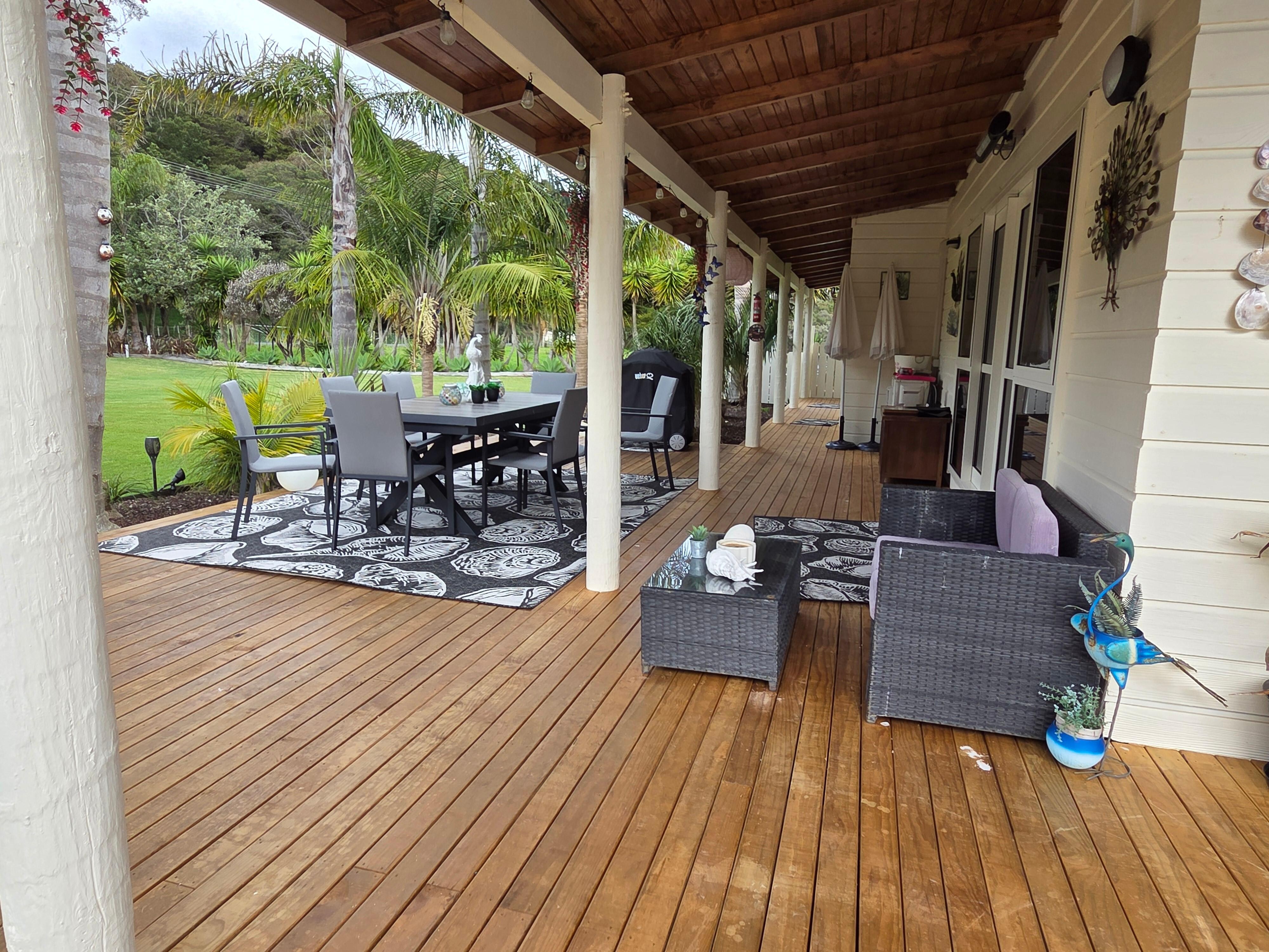 Awesome front and back decks with plenty of outdoor furniture plus barbecues and good lighting .