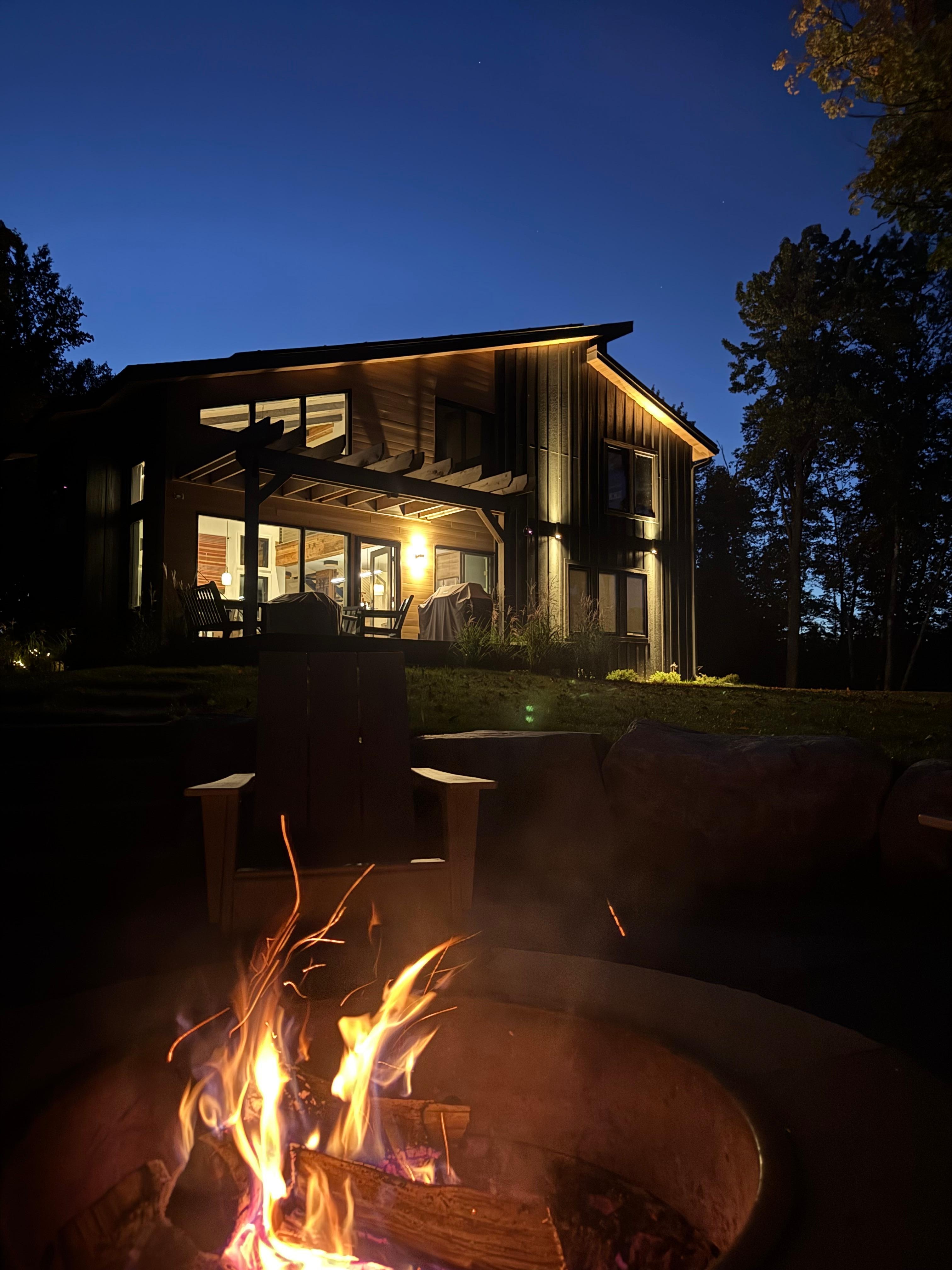 OUTDOOR LIVING- Large lakefront backyard, game-friendly front yard- 1,295 feet of private shoreline w/ dock - Deck w/ outdoor seating, fire table & grill - 20-foot custom fire pit - Canoe, paddleboards, kayaks, row boat, lily pad- Gear garage (bike/ski storage, yard games, snowshoes/poles, sleds)