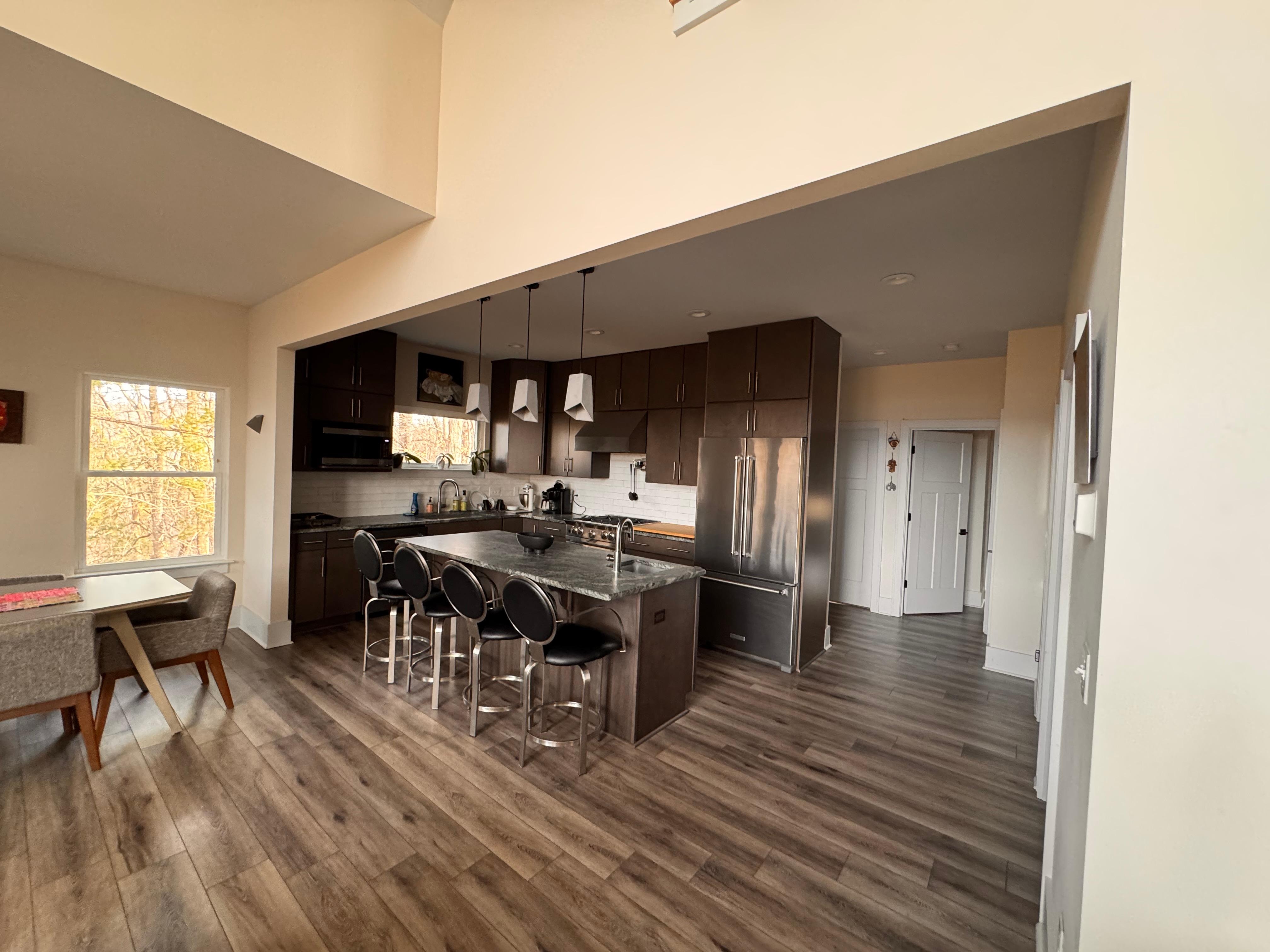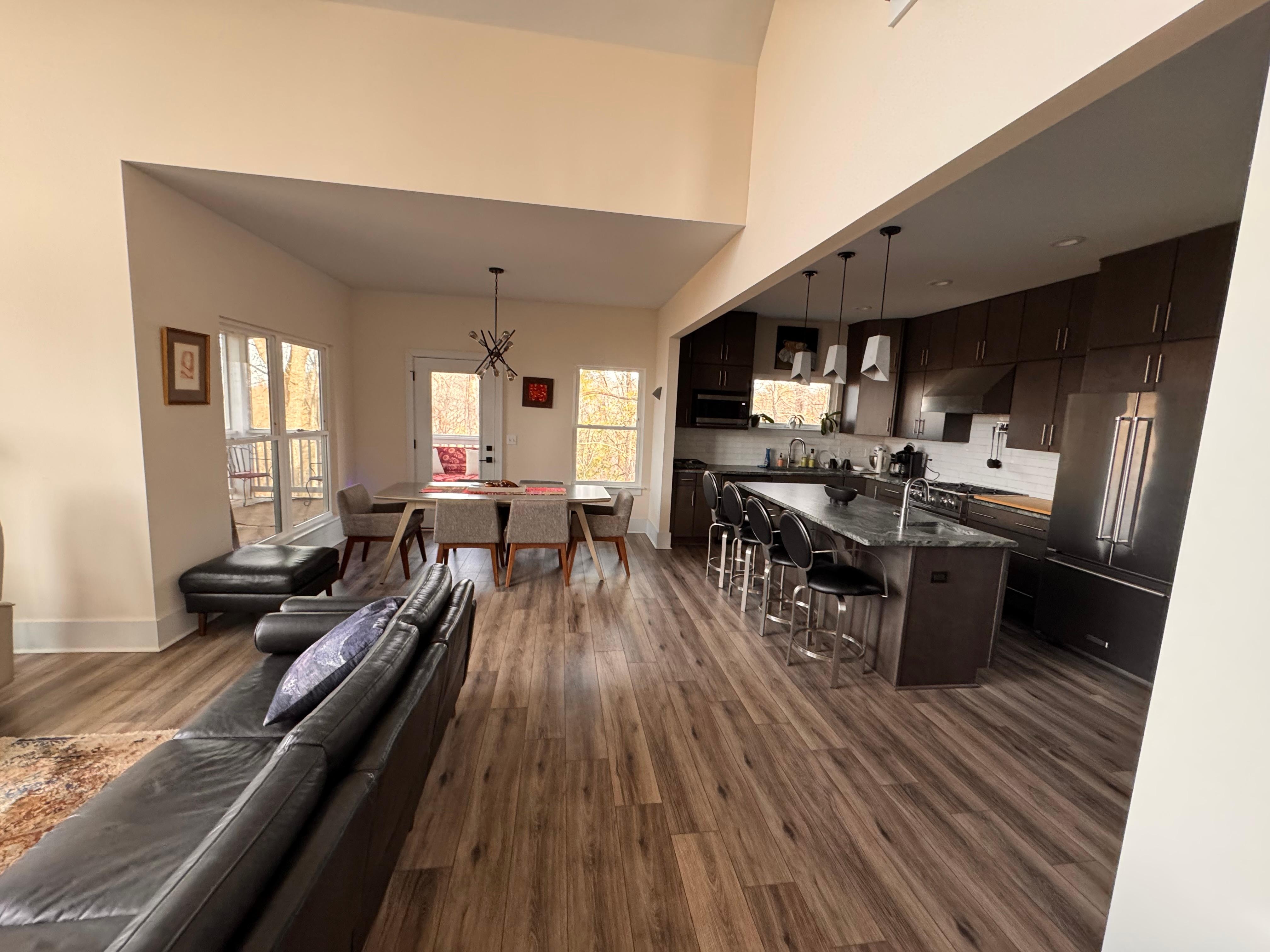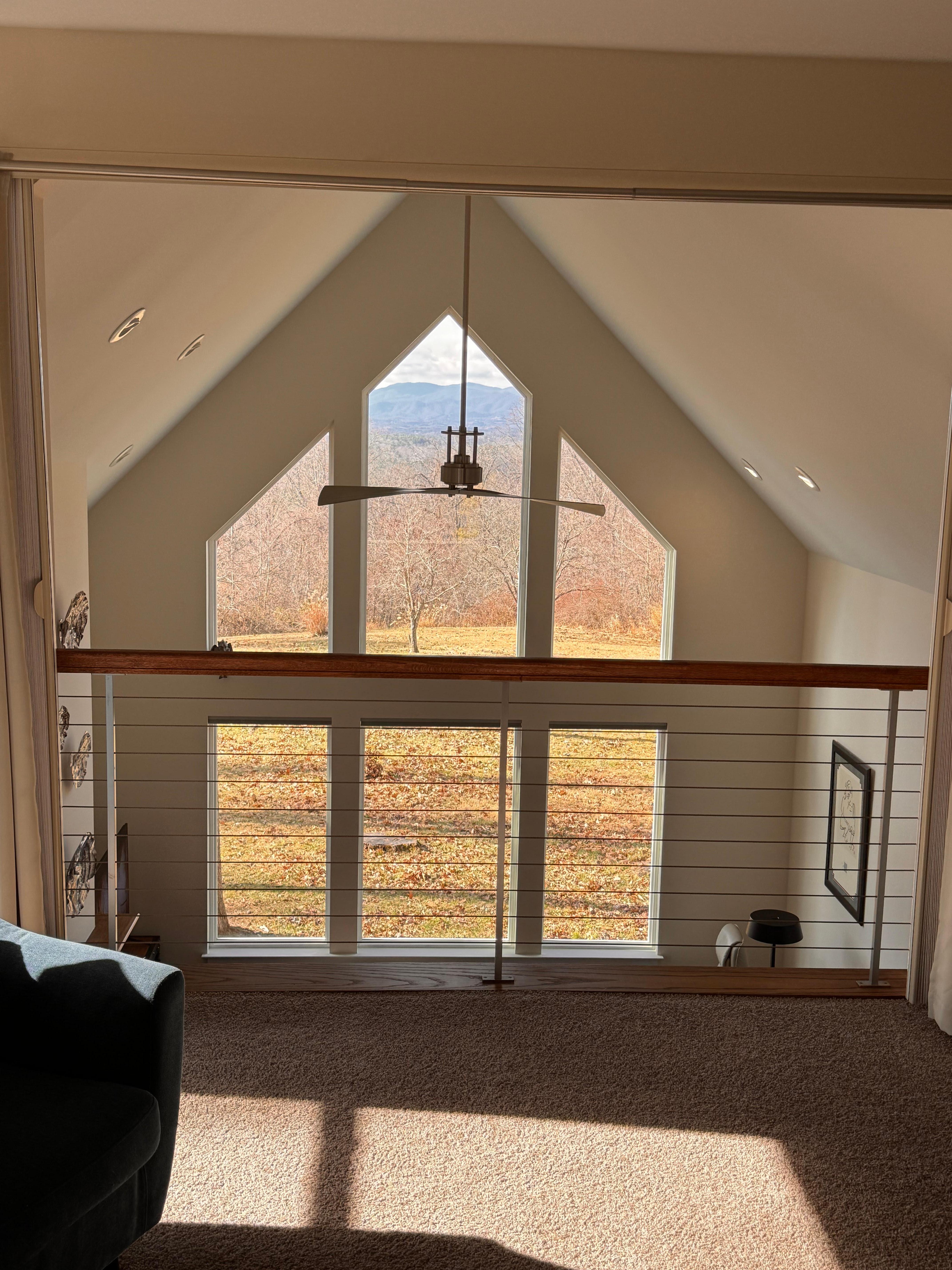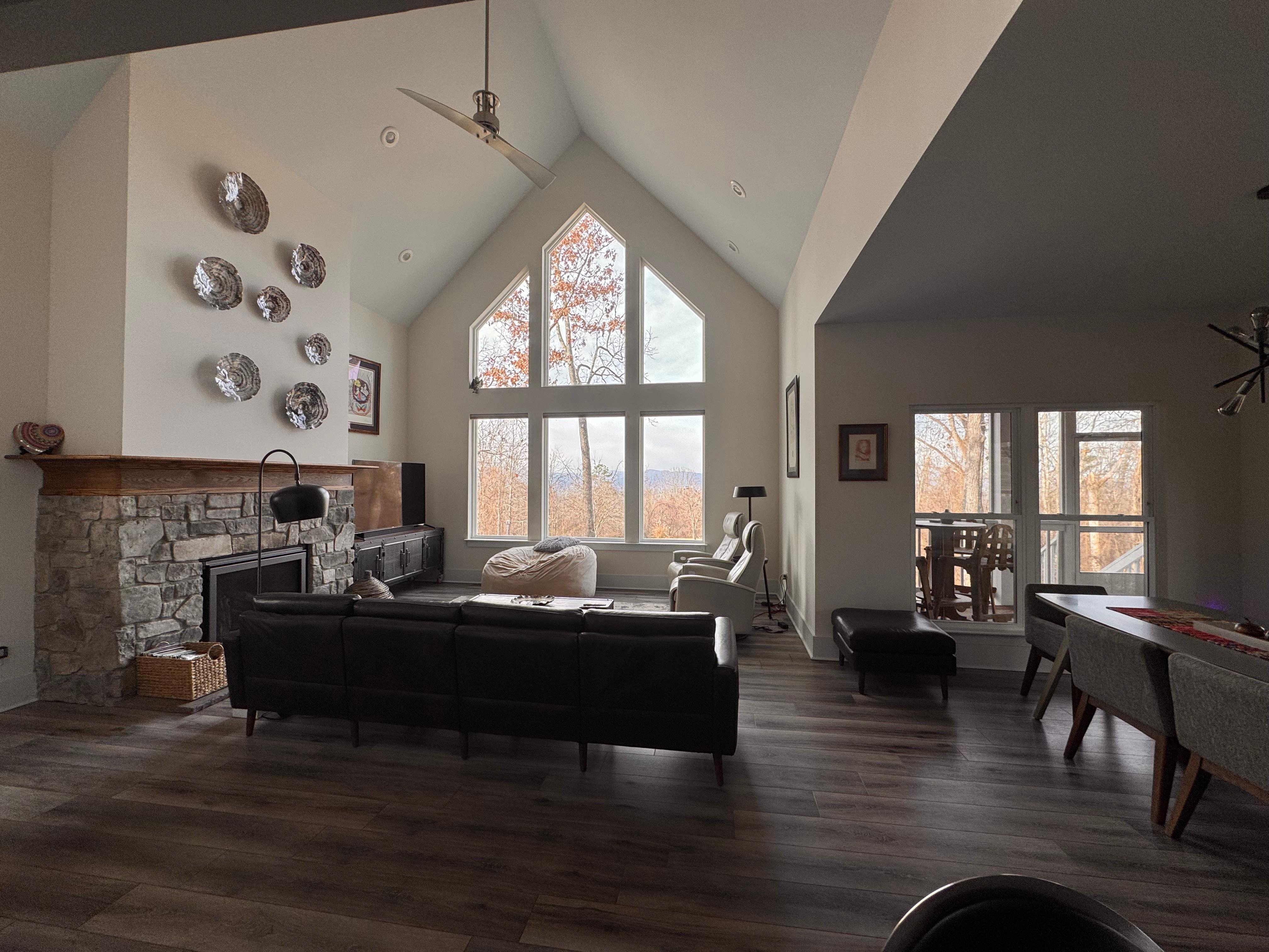 Newly constructed, private contemporary immaculate home up a .5 mile gravel road with 7 private mostly wooded acres. Stunning western views of the Blue Ridge mountains. Vaulted ceilings, chef's kitchen, screened porch, covered deck, fire place, outdoor fire circle and indoor steam shower. New furnishings and whole house air purification system. Very private yet 20 minutes from Asheville, hiking, rafting, skiing, biking, and of course the Biltmore Estate. **Front or 4 wheel drive automobile strongly suggested**