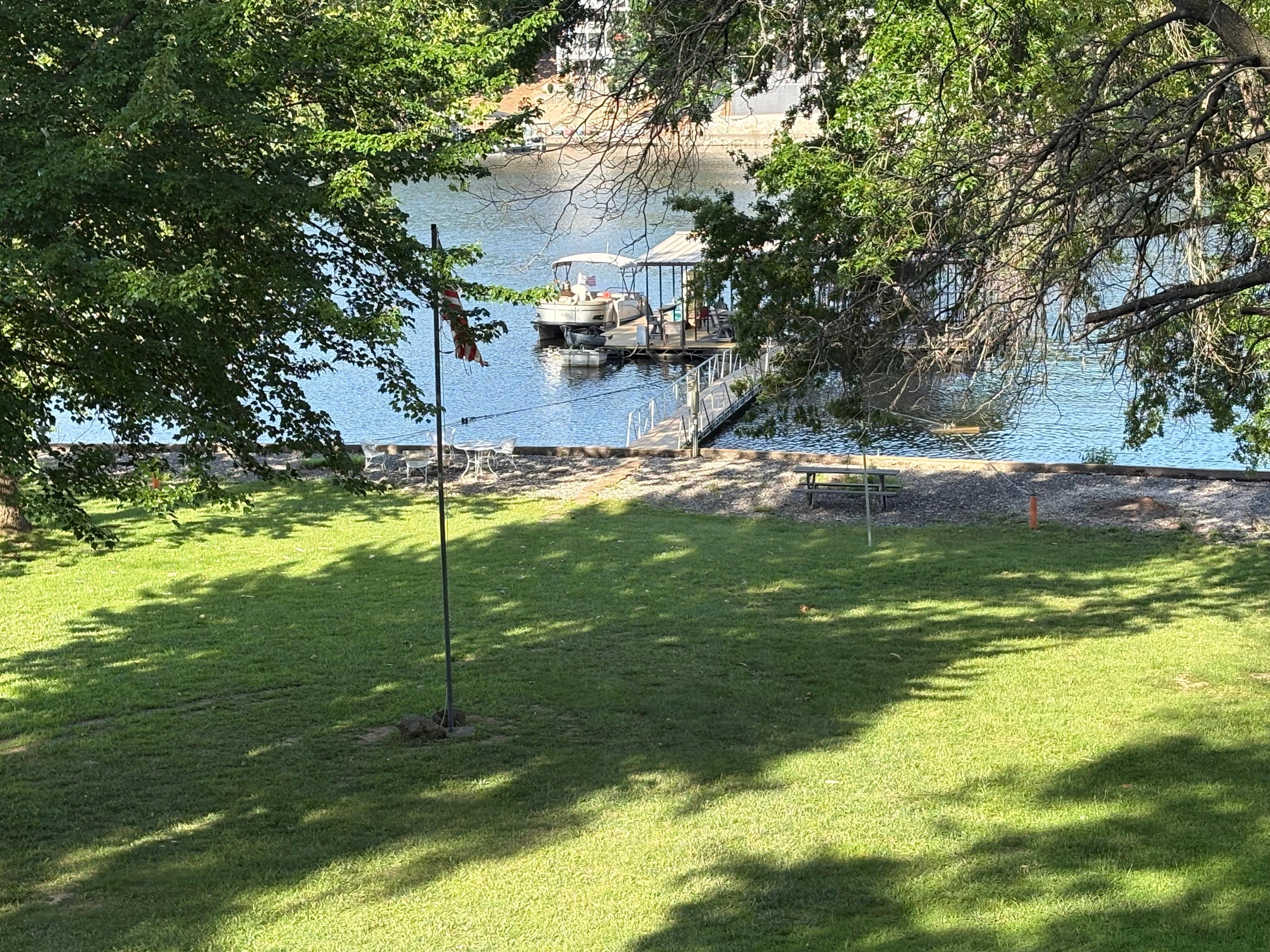 This home has a hard to find FLAT LOT that walks down to the dock and the lake. The dock has a sun deck, brand new 6 person composite counter height table with bar stools, drink bar, slide, swim ladder, etc. for fun, fishing, swimming or docking up your boat. There is a floating lily pad for use on the dock. There is also a huge deck off the back of the house that overlooks the lake. For colder nights, the sea wall has a fire pit.