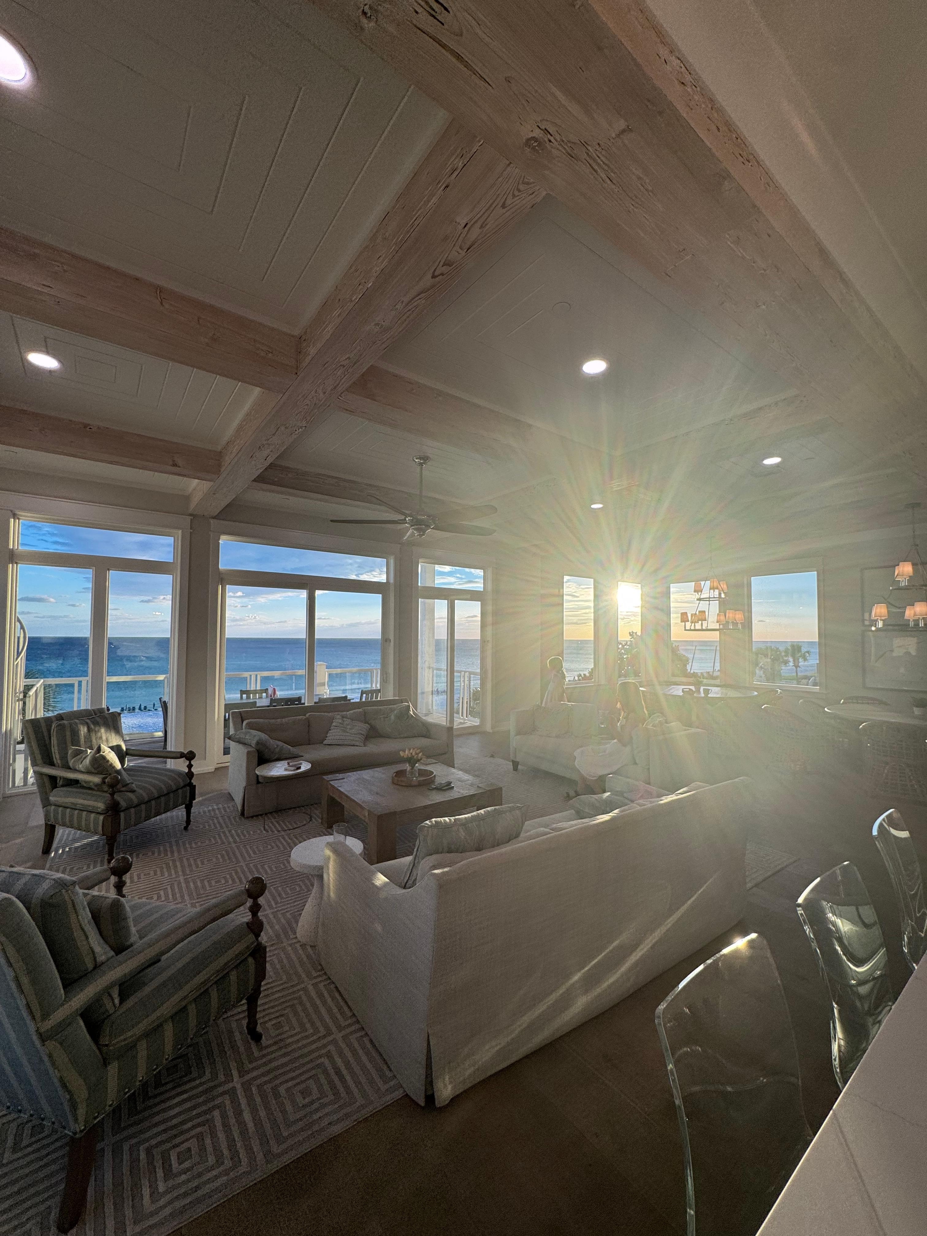 Head on up to the third floor where you will find a sitting area, perfect for a drink before heading down for dinner. On this floor, you will be swept away into a master bedroom with stunning views, a king-size bed, and a large private en suite. The master en suite has an oversized walk-in shower, his and her vanities, and a soaking tub with views of the emerald waters. You will also be spoiled by the mini kitchenette and coffee bar in the master suite, sip your coffee as the sun rises on the gulf front balcony. The second guest bedroom on the third floor has a king-size bed and en suite with two sinks, a walk-in shower, and a soaking tub. The third guest bedroom has a queen over queen bunk bed and en suite with one sink and a walk-in shower.