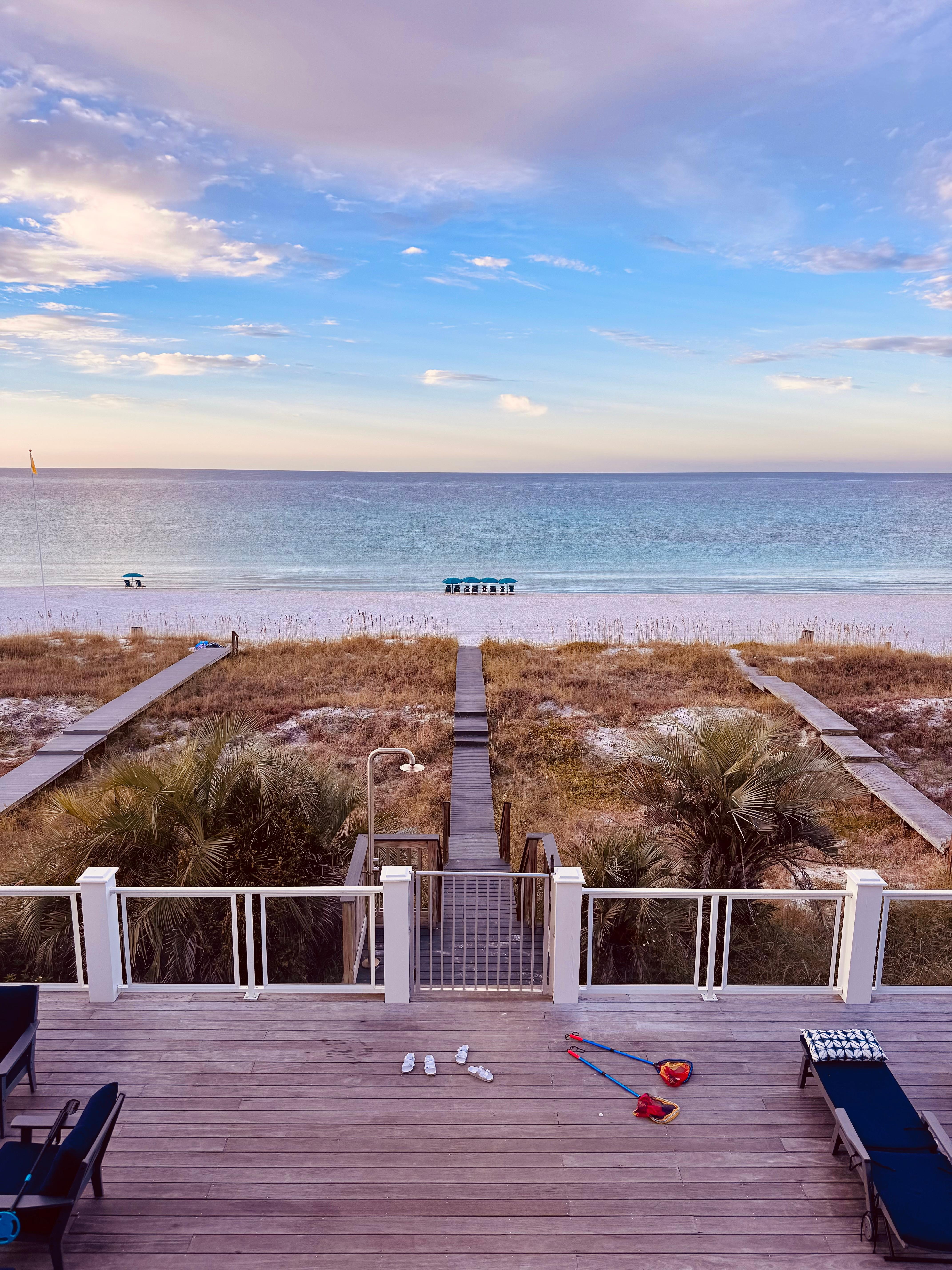 Take the elevator back down to the ground level and walk out to the white sand via the private beach boardwalk where you will have beach chairs set up for you, no need to bring your own. Eight chairs and four umbrellas are included in the rental, 365 days a year! When you've had enough summer sun, rinse the sand off in the outdoor shower before soaking in the hot tub while watching the sunset over our beautiful emerald coast.