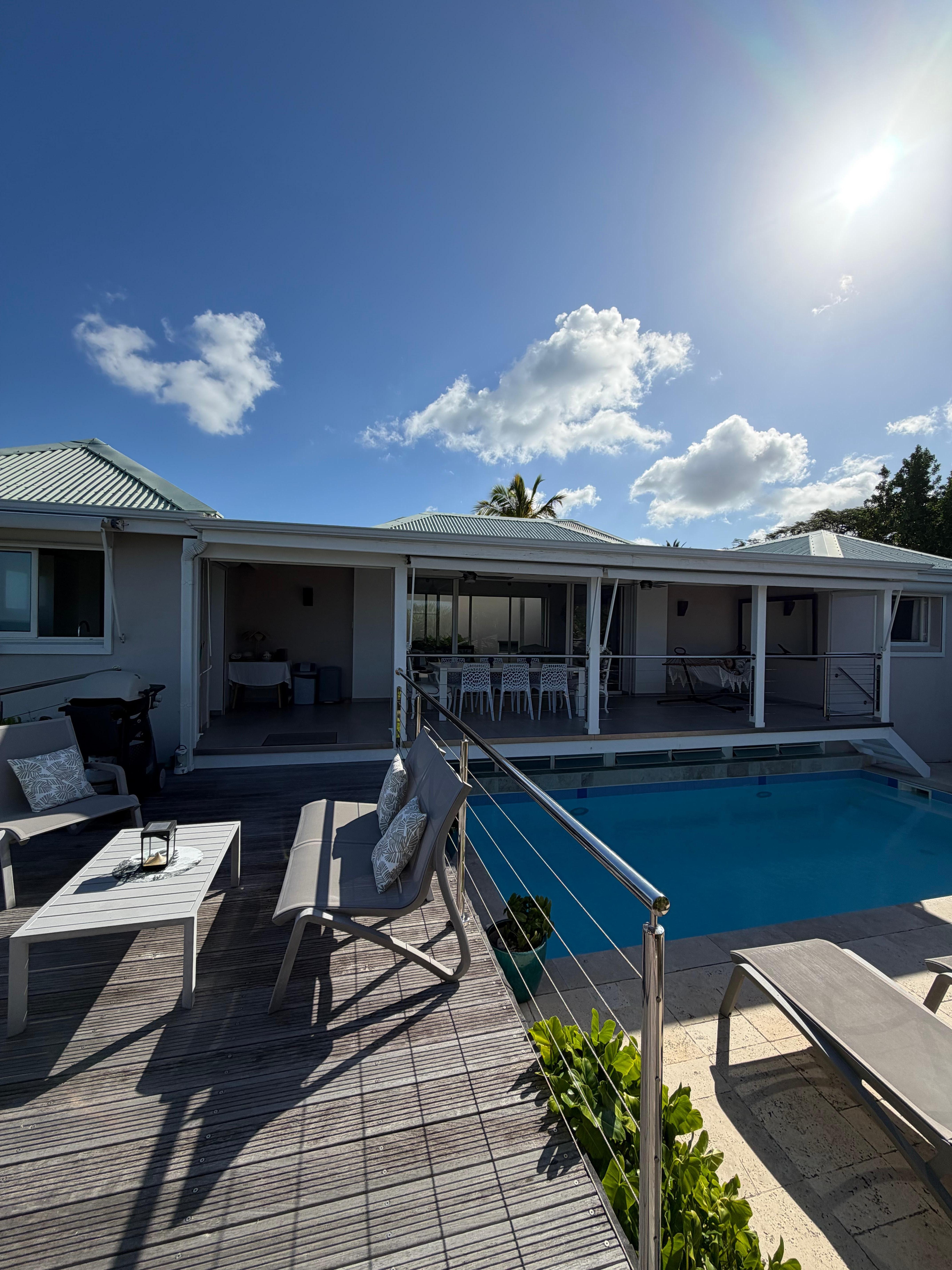 We liked everything, ITS MAGNIFICENT SEA VIEW, the private swimming pool opening onto a solarium, the terrace with a large convivial table and the spacious rooms with adjoining shower room.