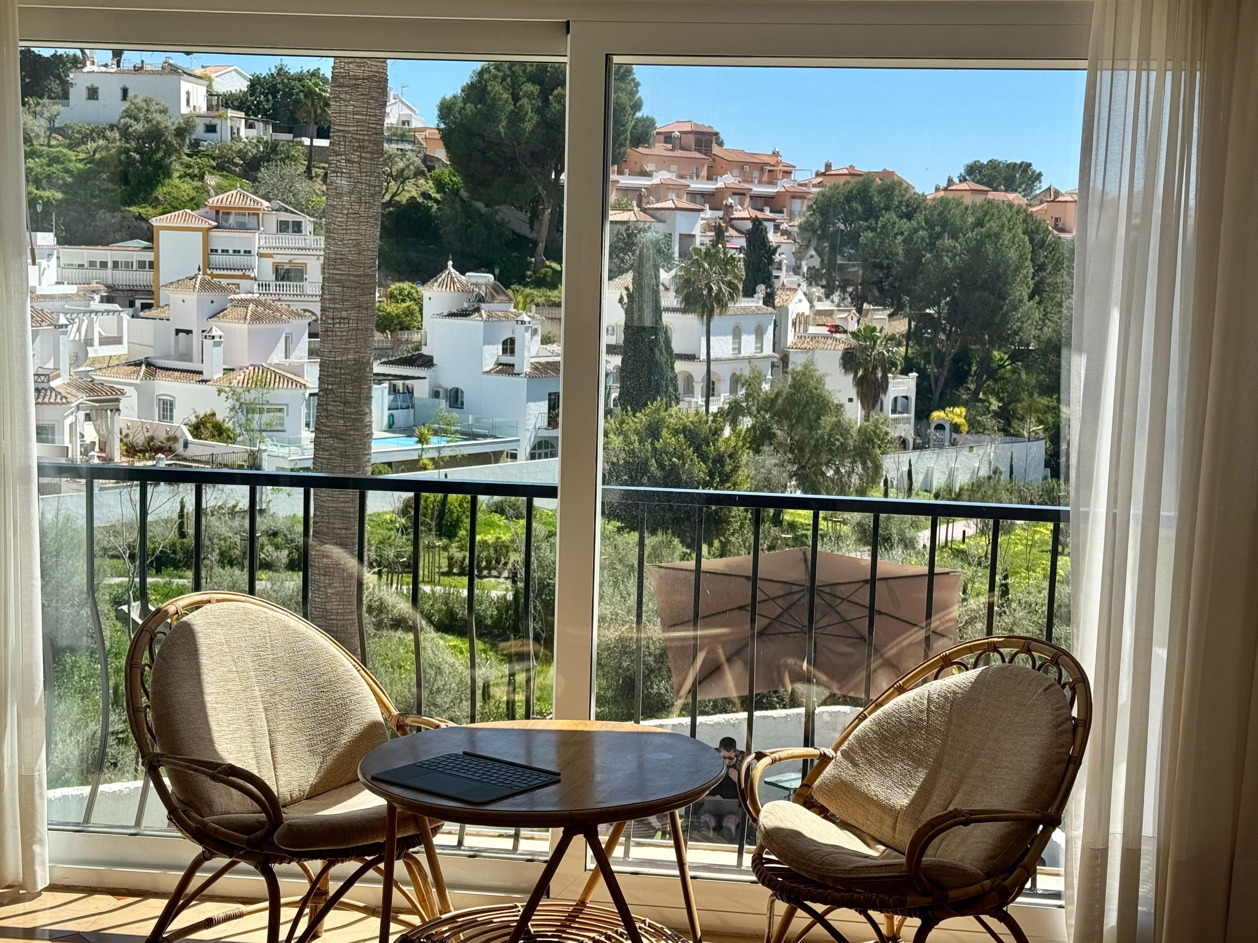 Upstairs is an open plan kitchen, dining, and living area with two bedrooms. Spectacular views through to the sea, and a veranda with comfy chairs for lounging. We sat there into the night and watched the moon rise over Nerja. Two bedrooms upstairs, the master also with an amazing view.