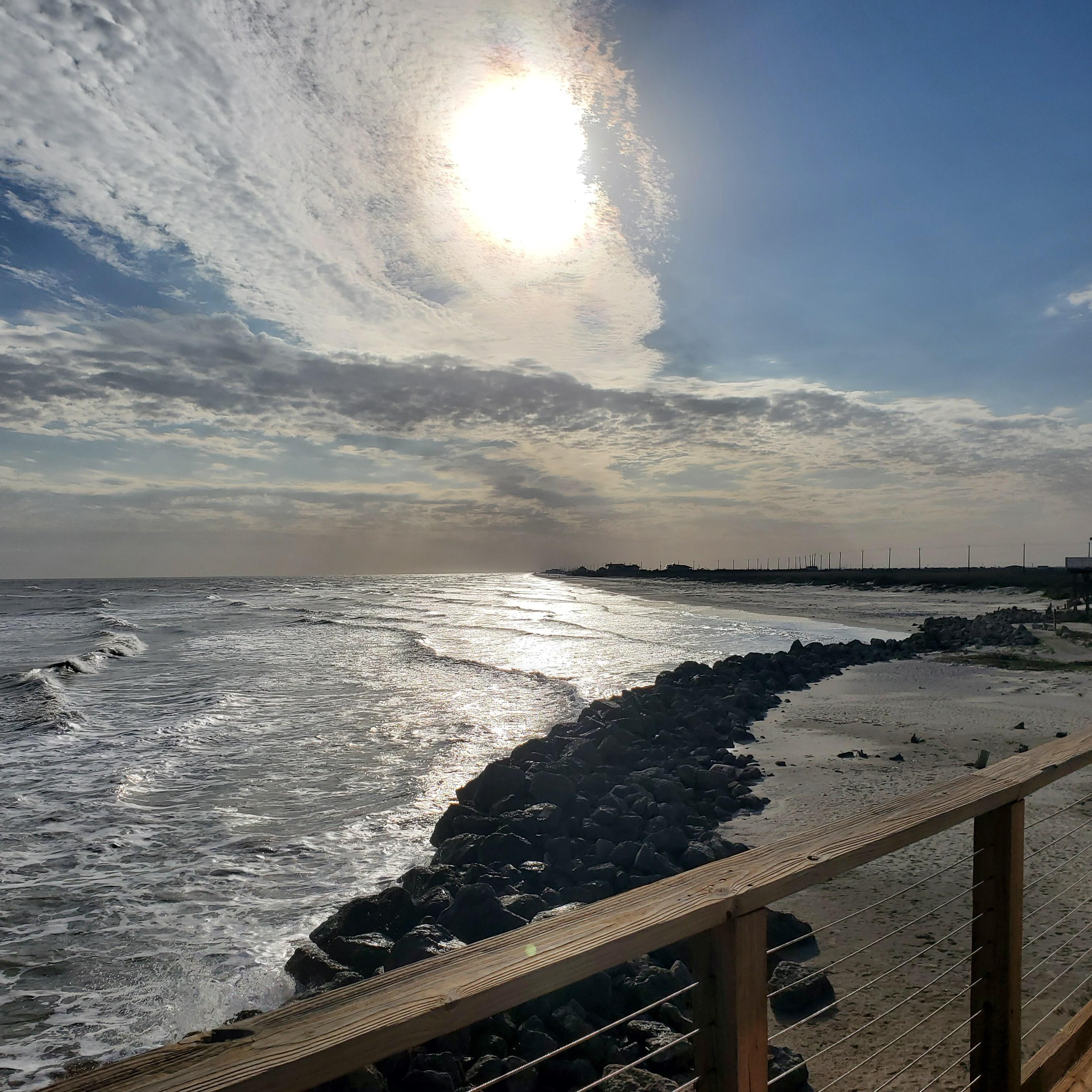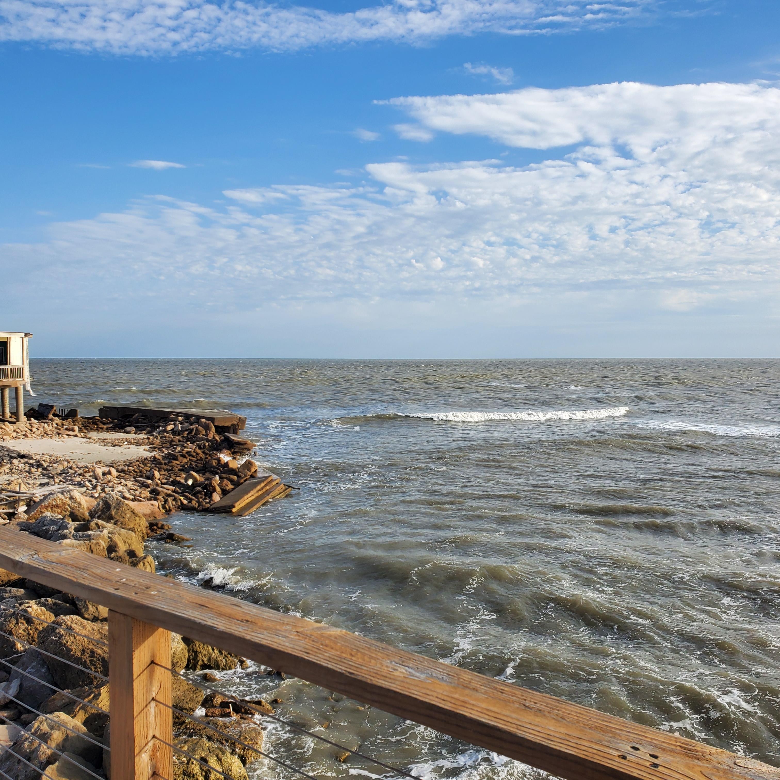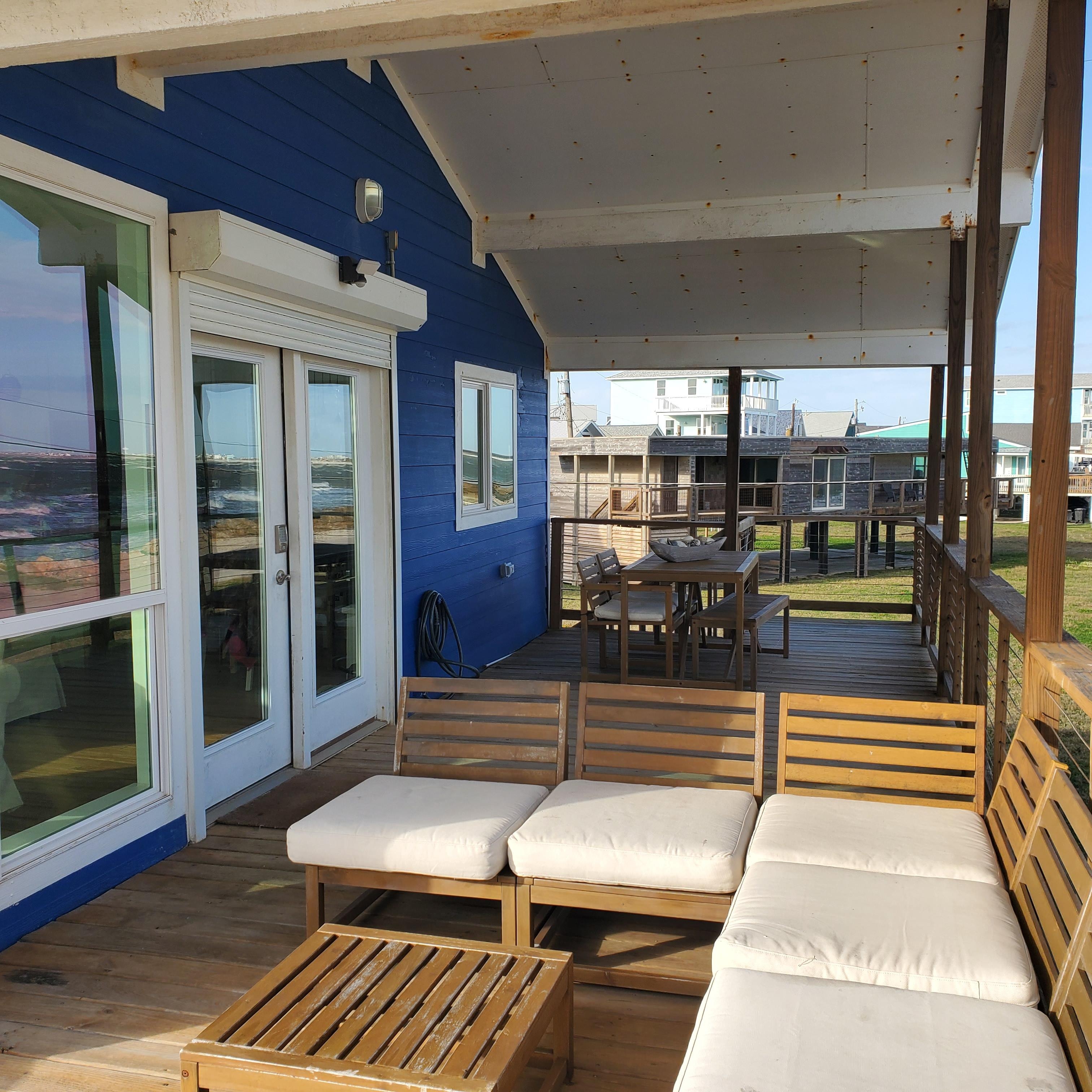 The porch areas offer a shaded dining area with a view out over San Luis Pass, a sunny (at least during the middle of the day) area with Adirondack chairs with views of the beach, and a shaded/sunny lounge area with views of both.