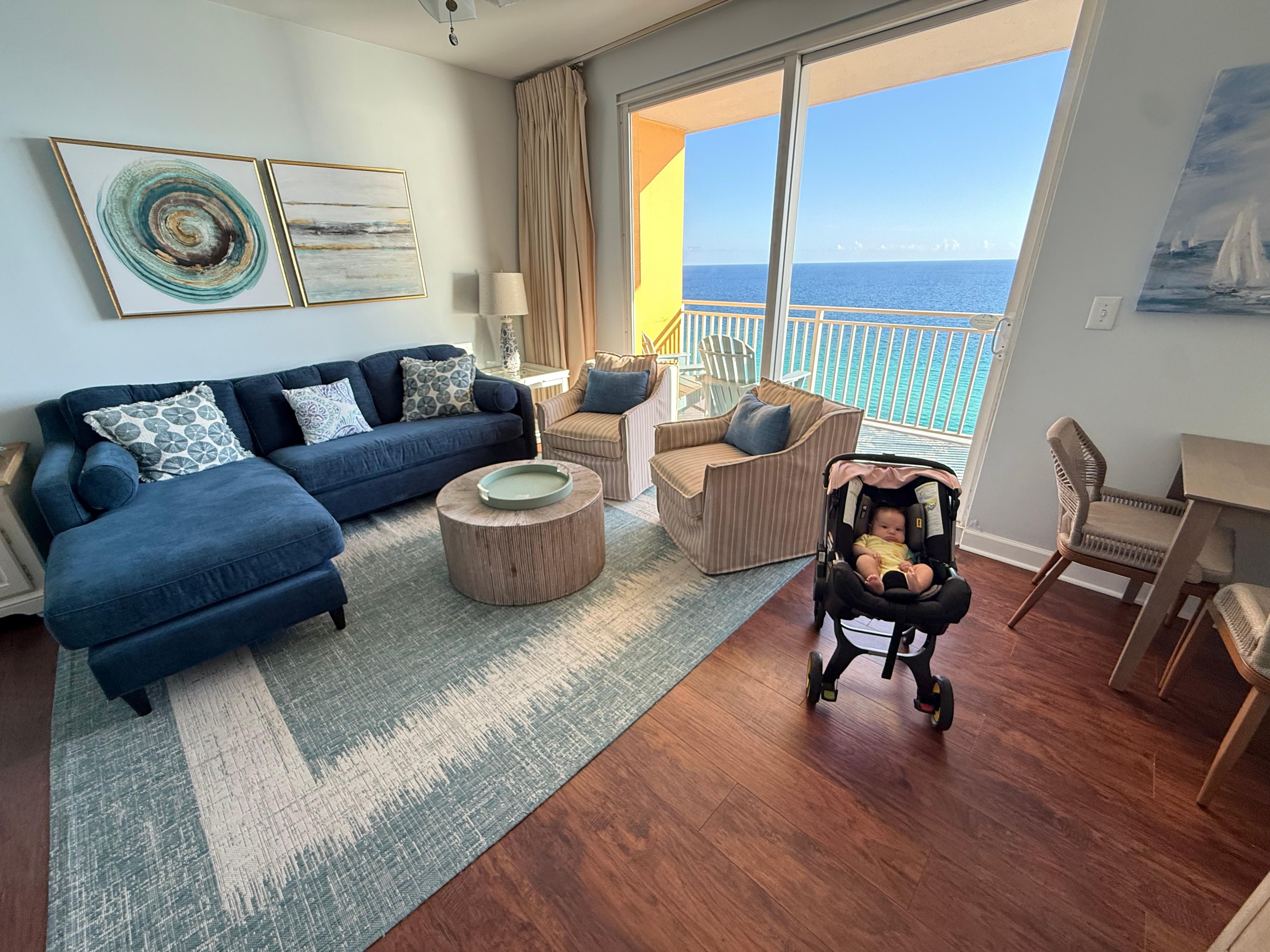 A large balcony with a table and four chairs and a chase lounge are directly over the beach and invites you to enjoy the beautiful view and warm Gulf breeze.
