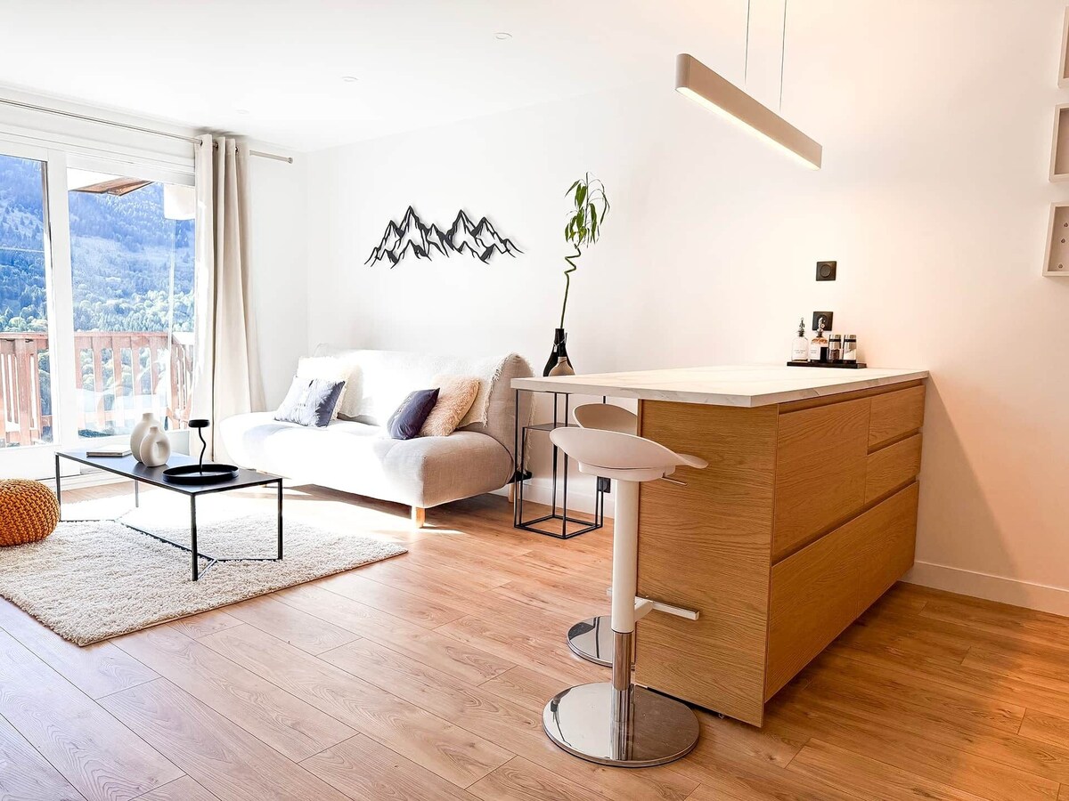 L'Étoile de Méribel : appartement cosy et rénové de 42 m² au cœur de Méribel, à 3 min du centre et 5 min de la piste du Doron. Grande chambre avec lit queen size, bureau et dressing, cabine enfants avec lits superposés. Cuisine moderne équipée ouverte sur salon avec TV connectée et canapé-lit. Terrasse de 11 m² avec vue imprenable sur les montagnes. Casier à ski privatif et parking à proximité.