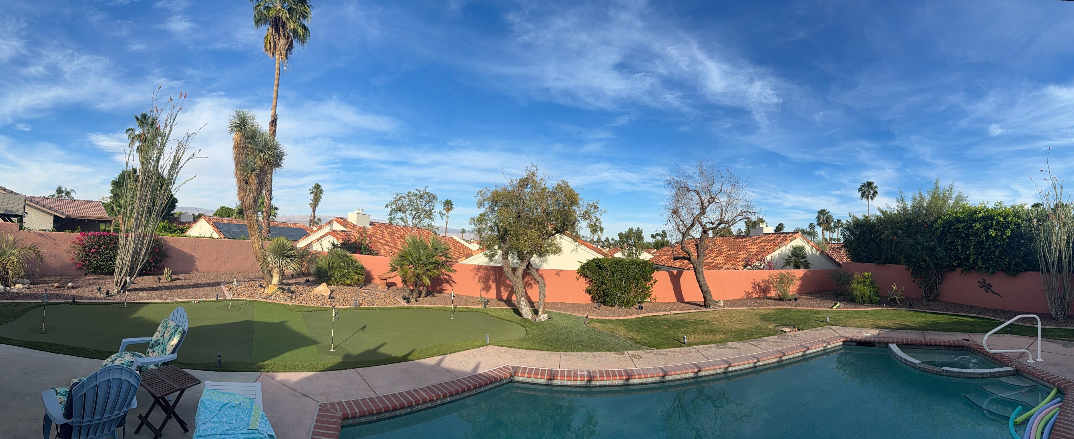 It is central to Indian Wells, La Quinta & Palm Desert.10 mins walk to the Indian Wells Tennis Garden; 8 mins drive to El Paseo shopping area, less than 6 miles to Coachella festivals & the Stagecoach. Beautiful backyard w/private pool/spa/gazebo lounge area w/5 hole professional putting green& gorgeous mountain/sunset views. Private Saltwater Spa/Pool. It is 3bd, 2ba Ranch resort home.1 car & 1 golf cart garage, plenty of parking spaces on driveway/street. Each Rm has its own RokuTV. A perfect vacation home getaway.