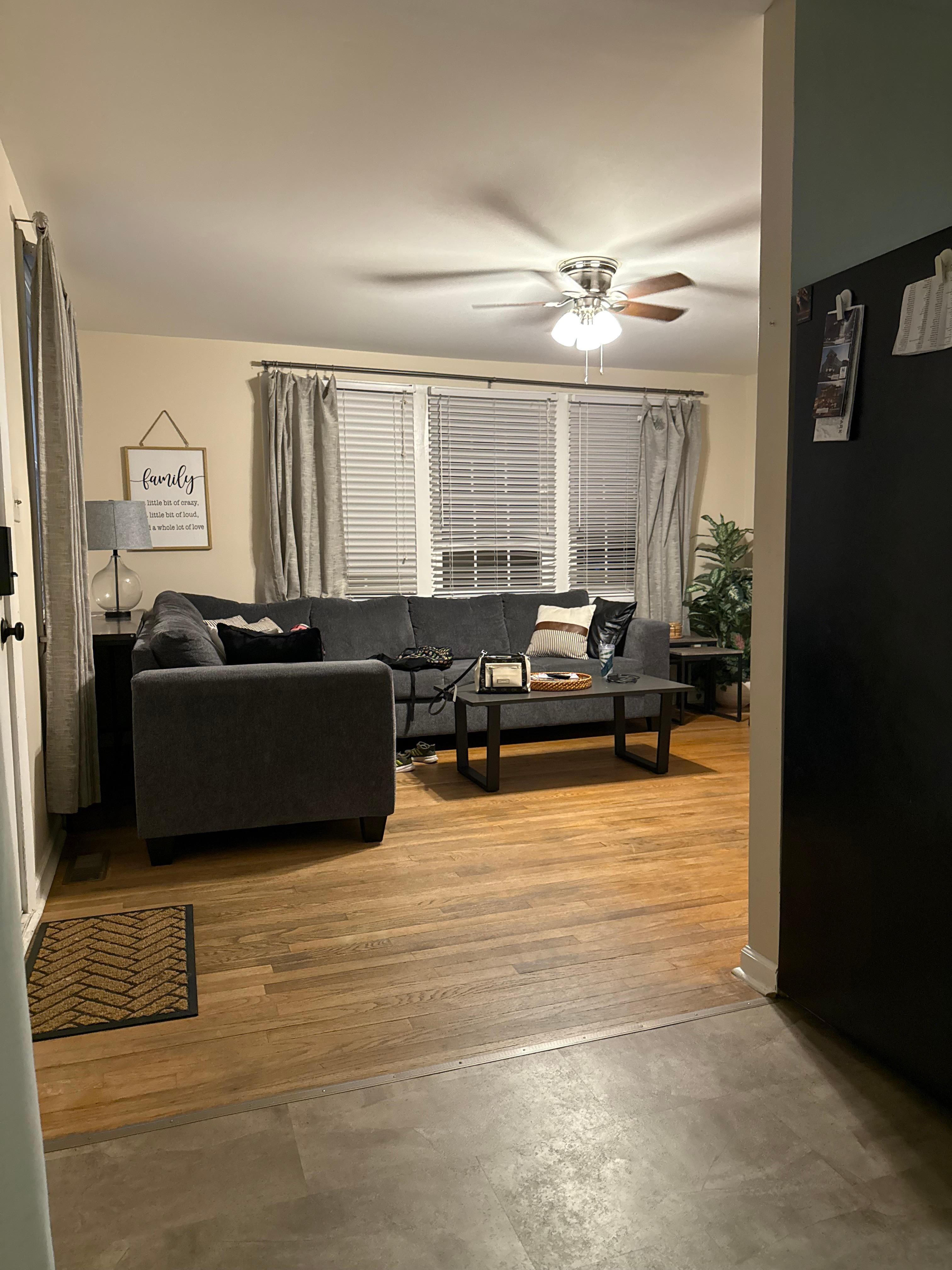 Comfortable open floor plan - living room with 50in flat screen television with cable and streaming devices, fully equipped kitchen with black stainless steel appliances.