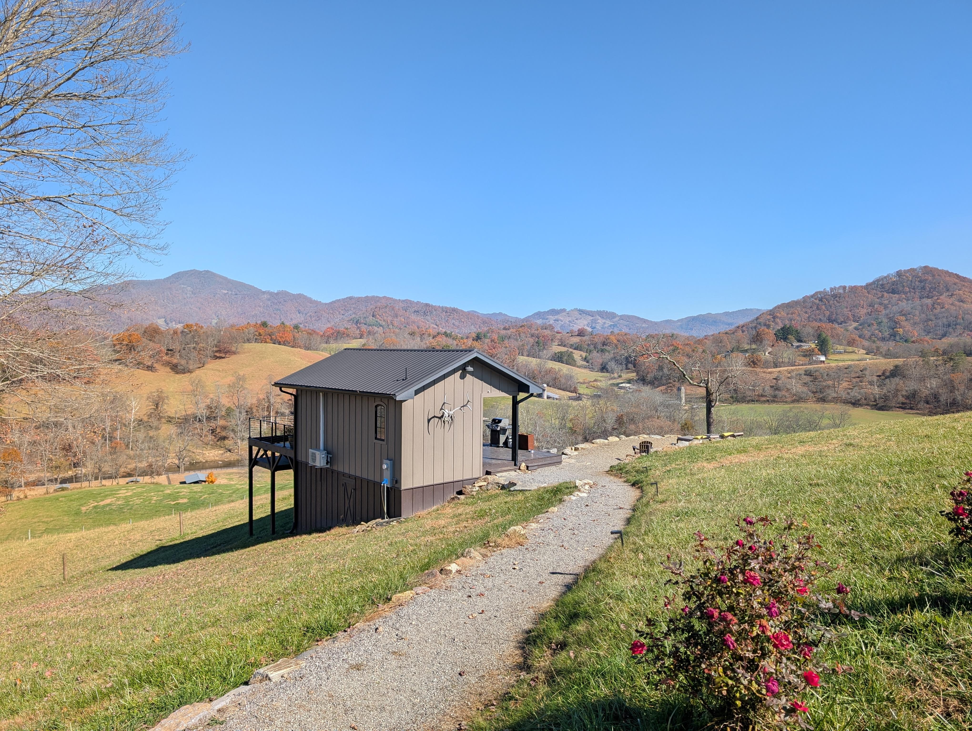 We are a working Mangalitsa farm on 95 acres in the Smoky Mountains of NC. Located on a half mile of river and less than a mile off of I 40. It is remarkable to be so accessible and yet feel so remote. Quiet and safe, our farm is a true marvel! 17* N enjoys its own private setting on a mountain pasture hillside. Oriented toward the river and other farms the scenery is endlessly changing with the sights and sounds of rushing water and birds. The cabin boasts a king sized bed with 680 Egyptian cotton sheets, double comforter and four king pillows. The mood is set with a wall hanging electric fireplace with heater option and electric remote controlled candles. Every light both inside and outside of the cabin may turned off and most can be dimmed to the desired setting. AC and heat keep you comfortable. Additionally there is a kitchenette with a convection toaster oven, double burner portable stove top, freezer and refrigerator drawers as well as a Keurig coffee machine with complimentary coffee pods. The large pea gravel patio is equipped with a Weber propane BBQ with side burner, two Adirondack chairs flanking a propane firepit and two chaise sun chairs complete with pillows and beach towels. The cabin is instantly transformed into an open-air experience upon raising the 10' wide glass garage door! Step out onto the large wooden deck outfitted with a giant U shaped sofa ensemble and an in-deck hammock with pillows perfect for napping and stargazing!