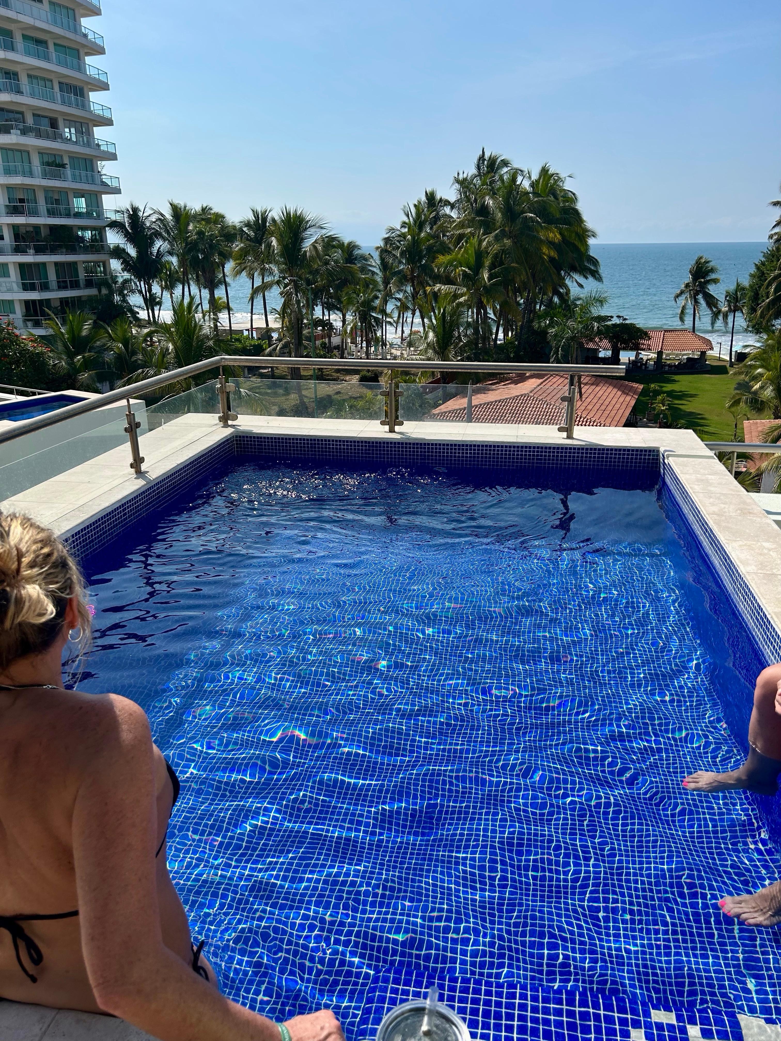 DECK: is a highlight of this rental due to its fabulous views, its size, the covered area and the personal pool. The pool was extremely clean and well maintained. You can see and hear the ocean & beach from the deck. They provide two loungers & a table that can seat 6-7 people. One drawback is that you can hear other units when they are outside on the deck. KITCHEN: is small but has all of the utensils, pots, oven, toaster, blender, kettle, microwave, fridge and cooktop to make meals. The quality of these items are on the low side Security offers 20 liters of water for 45 pesos