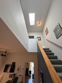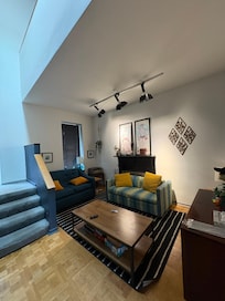 The Doxie is a two-story townhouse with a private entrance and off-street assigned parking with enough room to park two vehicles in tandem (one in front of the other). The space includes a full kitchen and living room on the main floor with two bedrooms (one being a loft) and full bath on the second floor. All basic cooking essentials, linens, towels, iron, hair dryer, shampoo, conditioner, body wash, standard cable, high speed internet, and a 48" SMART TV are provided. Free washer and dryer, with complimentary laundry detergent, are located in the basement for your use.