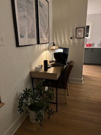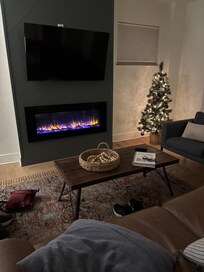 The relaxing private front porch welcomes you to The River Birch unit. You enter the bright and newly renovated townhome and your eye is instantly drawn to the unique herringbone designed electric fireplace that holds a 50" Smart TV. There is a designated desk with plenty of outlets, and fast WiFi for you to work or play. The living space is bright and open to the eat-in kitchen featuring loads of storage, a bar that seats 3 and a dining set that seats 3. The kitchen is fully stocked with cookware and essentials to get you started on your cooking as well as takeaway coffee cups. You will find an assortment of complimentary k-cups in the drawer beneath the Keurig K-Cup Duo.