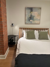 On the top floor are two hotel worthy bedrooms, both uniquely designed, with queen sized beds. They each are outfitted with Smart TV's, blackout curtains, sizable closets with luggage racks, and hangers to stow your things.
