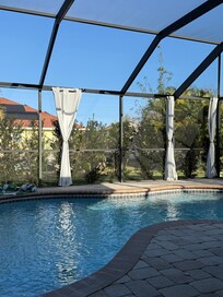 Located in a quiet neighborhood with a lanai covered, heated pool for your own privacy. Several pool toys and floaties available. Large 75" smart TV with fast internet. Full kitchen inside and a gas grill & smoker on the lanai patio. Two car garage for use also.