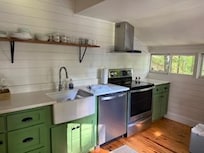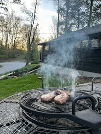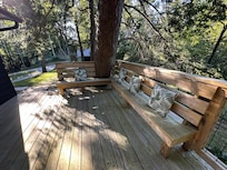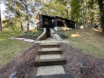 It’s a cabin nestled in 9 acres of woods. There is an entrance gate followed by a gravel drive to the parking spot next to the cabin. There are rock steps without handrails leading to the doorway. An elderly person or person with balance difficulty might need assistance to navigate the steps leading to the front door. The entire cabin, patio and woods are available to stay in and explore.