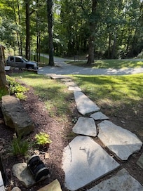 There are rock steps from the parking space to the front door that do not have handrails.