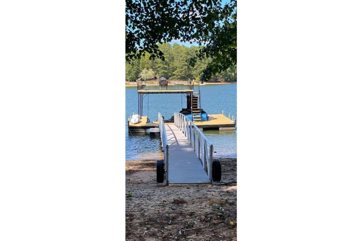 Relax with the whole family at this peaceful lake house on a wooded lot. Newly remodeled. Double decker dock with stunning views of Lake Lanier. Fire pit, corn hole, bonus room for kids with big screen TV. 5 minutes from the North Georgia Premium Outlets with restaurants and grocery stores close by.
