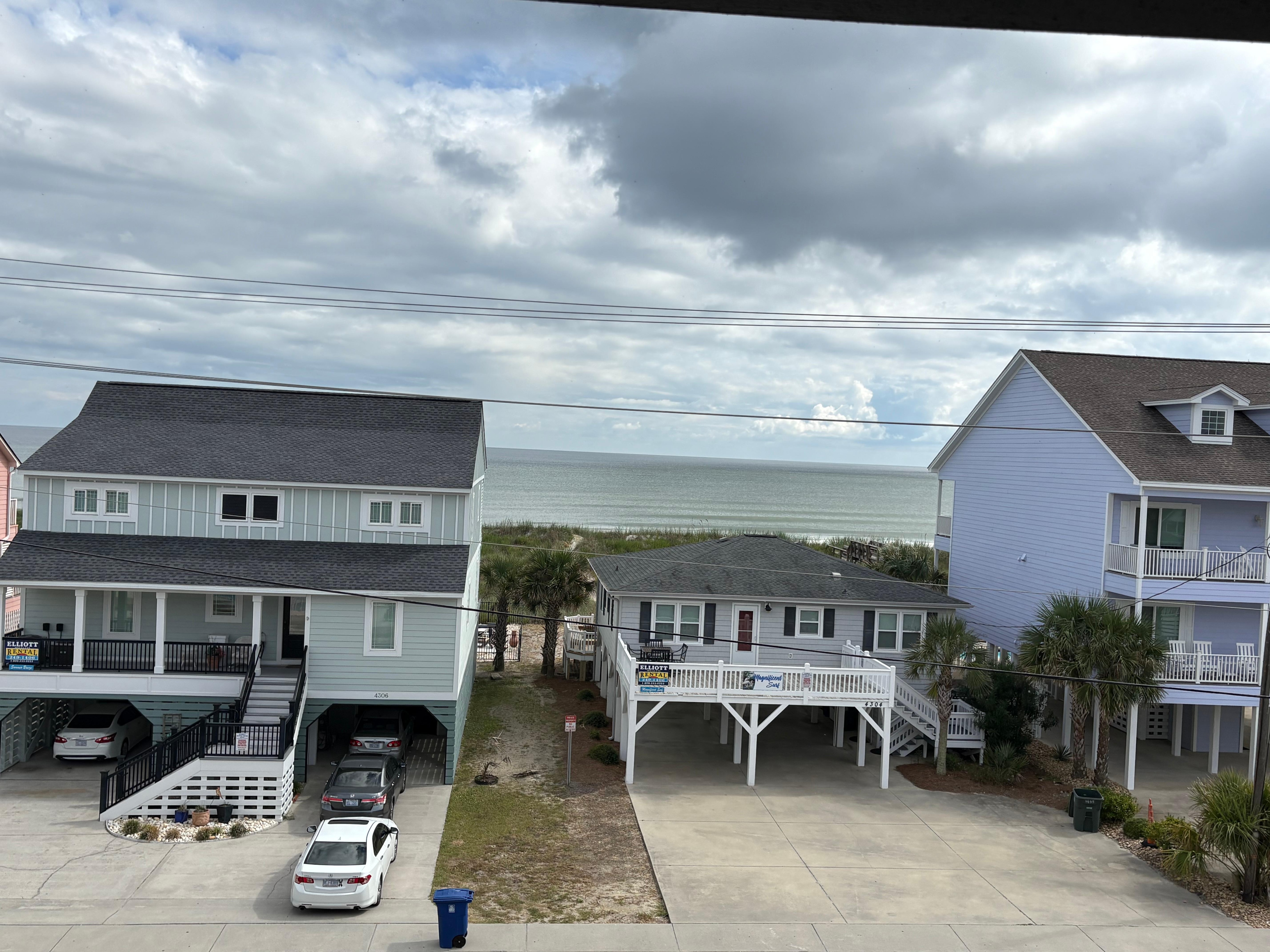Torn between the ocean view and the sound side view? With this oasis you won't have to choose. Watch the sound from the window in the kitchen and enjoy the ocean views from the primary bedroom as well as the living room. Dining room is set up for family style with a bench style seating area. Each bedroom comes with its own private bath. Living room provides ample seating with a pull-out couch for extra guests. Kitchen is well equipped. Just bring your bathing suit to explore all Cherry Grove has to offer. Did I mention the pool that's right in front of you? We offer many games and puzzles and books for you. This is a 3rd floor unit with no elevator. You can rent linens for $55 for your stay and can rent a beach tent upon request as well. Pool is open April-October